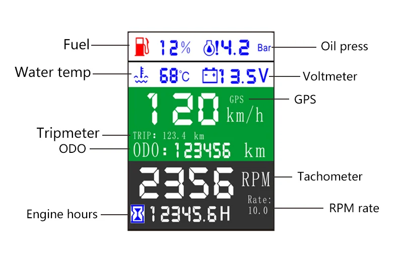 -GPS SOG: скорость над землей: 0-600 км/ч-ODO: одометр: 0-999999 км-Путешествие: 0-999,9 км(Может быть отрегулирован задней кнопкой.)(Возврат нуля при отключении электричества)-COG: курс по земле