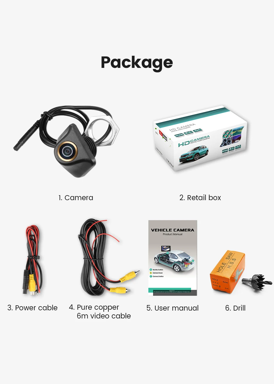 1. Камера заднего вида2. Розничная коробка3. Кабель питания4. Чистый медный 6 м видео кабель5. Руководство пользователя6. Сверло