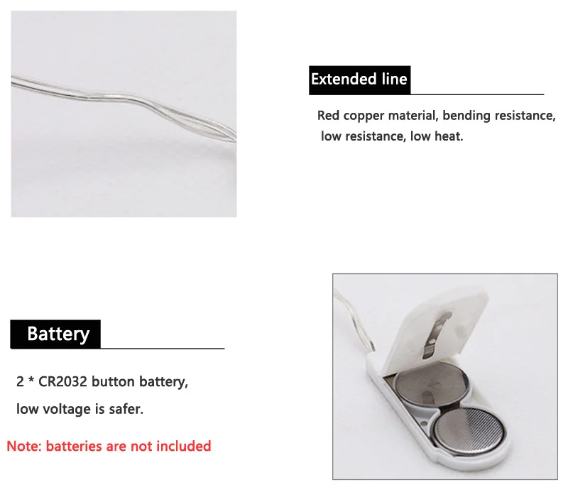 Питание от 2 шт. * батареи CR2032(Не входит в комплект)Материал: медная проволока и ПВХДлина: 1 м/2 м/3 м/5 мРасстояние между 2 светодиодами: 10 см (4 дюйма)Количество светодиодов: 10 светодиодов 20 светодиодов/30 светодиодов/50 светодиодов3 режима: вкл. (постоянное включение); ВЫКЛ.Водонепроницаемость: Да, батарейный отсек хорошо защищен при использовании в дождливые дниНапряжение питания: 3 в Посылка включает:20X светодиодные батареи струнные огни(Батарея в комплект не входит)
