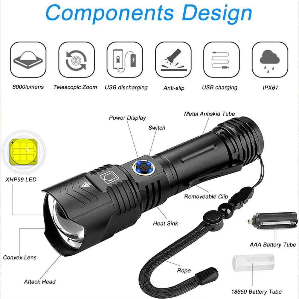 Мощный светодиодный фонарик, уличное освещение, водонепроницаемый Usb Перезаряжаемый фонарик 18650, портативный фонарик с зумом, фонарик