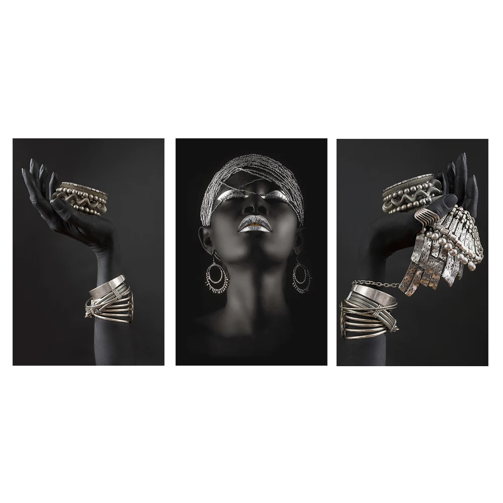 Сексуальная Африканская женщина с серебряными украшениями, настенные художественные плакаты, 3 панели, черная модель, холст, картины, модульные картины, домашний декор, Таблица