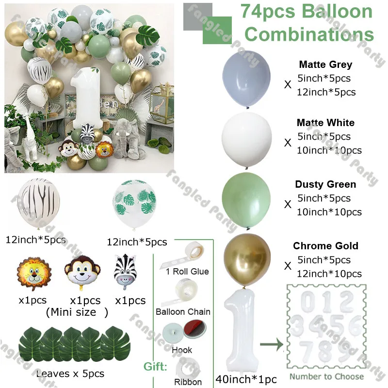 Матовый серый (5 дюймов * 5 шт., 12 дюймов * 5 шт.)Матовый белый (5 дюймов * 5 шт., 10 дюймов * 10 шт.)Пыльно-зеленый (5 дюймов * 5 шт., 10 дюймов * 10 шт.)Хромовое золото (5 дюймов * 5 шт., 12 дюймов * 10 шт.)Воздушный шар с животным узором 12 дюймов * 5 шт.Прозрачный воздушный шар 12 дюймов * 5 шт.Мини Воздушный Шар Из Фольги в виде животного * 3 штБелые цифры фольги воздушный шар 40 дюймов * 1 штЛистья черепахи 5 шт.Бесплатно для вас: 1 рулон клея точки, шар цепи, крюк, лента