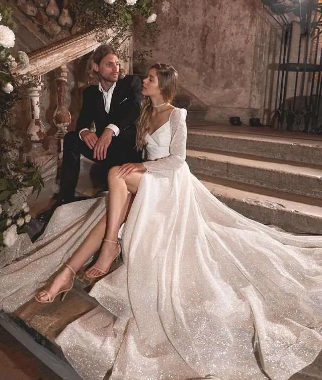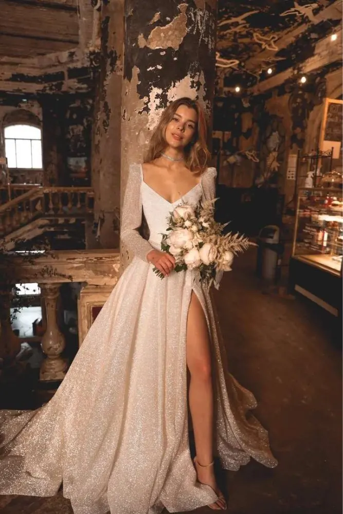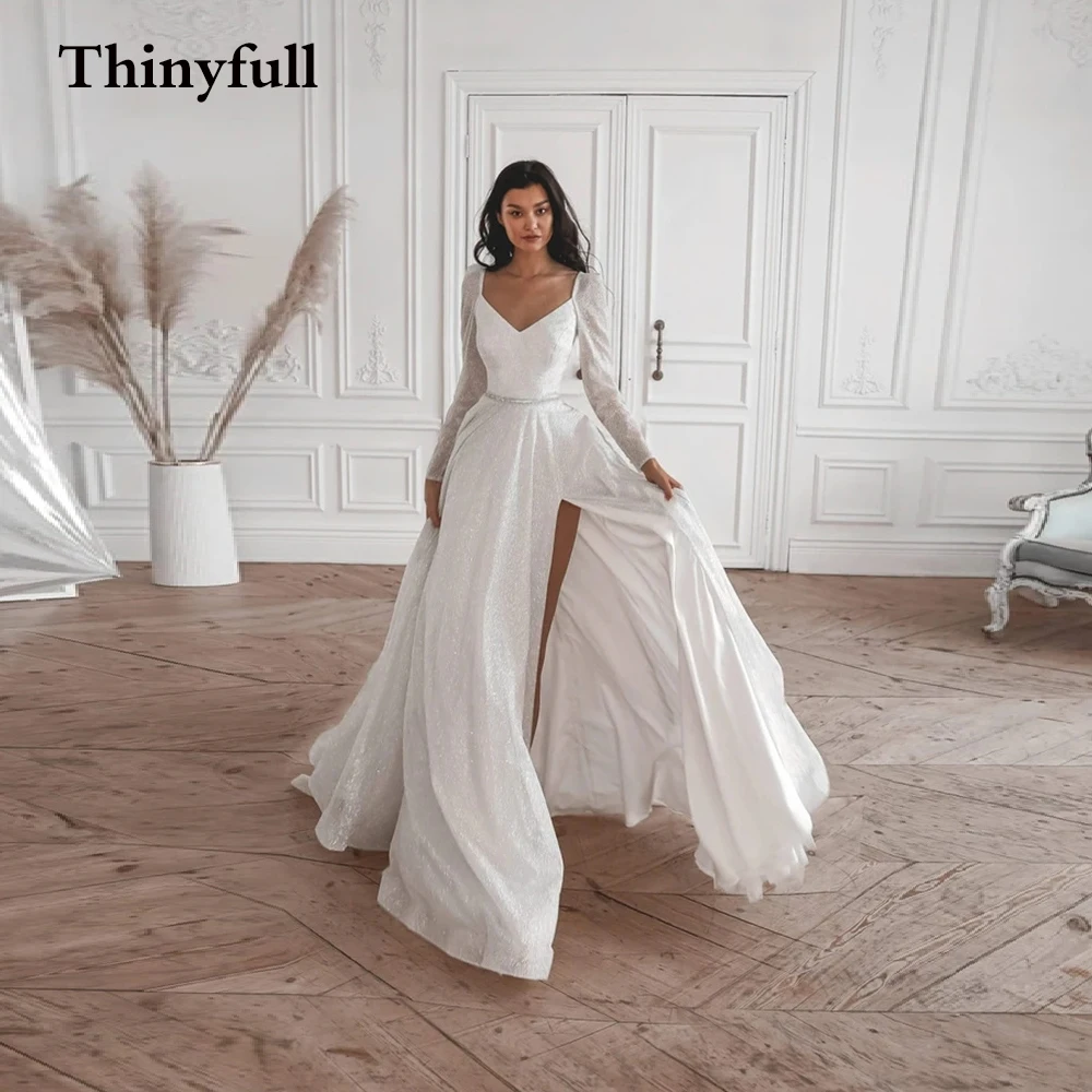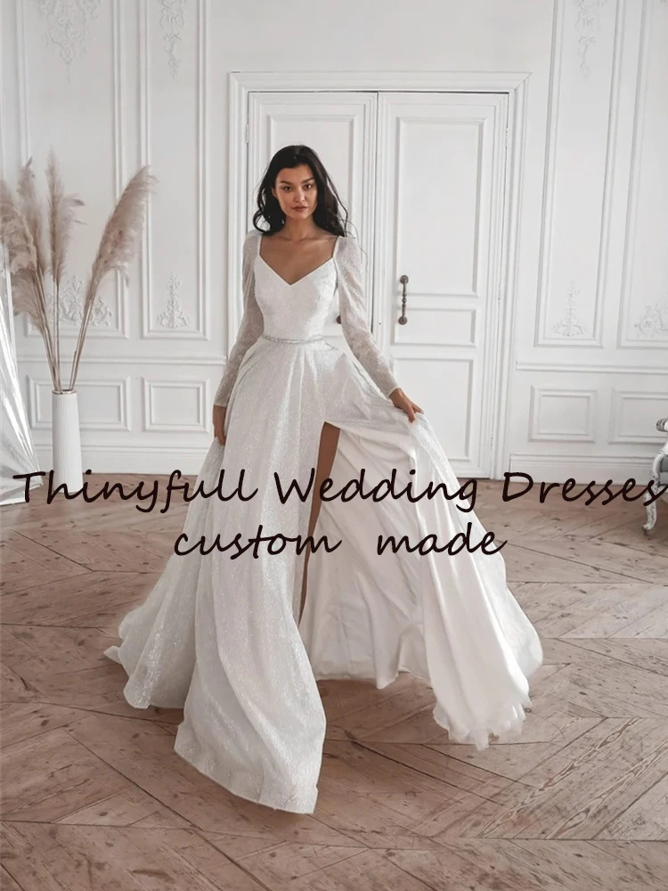 Thinyfull Блестящие Свадебные платья с Боковым Разрезом 2022 с длинным рукавом трапециевидные Свадебные платья для невесты