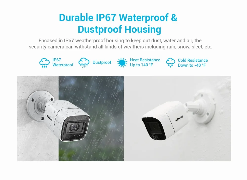 Оснащенный водонепроницаемым корпусом IP67 для защиты от пыли, воды и воздуха, камера безопасности может выдерживать все виды погодных условий, включая дождь, снег, сани и т. д.