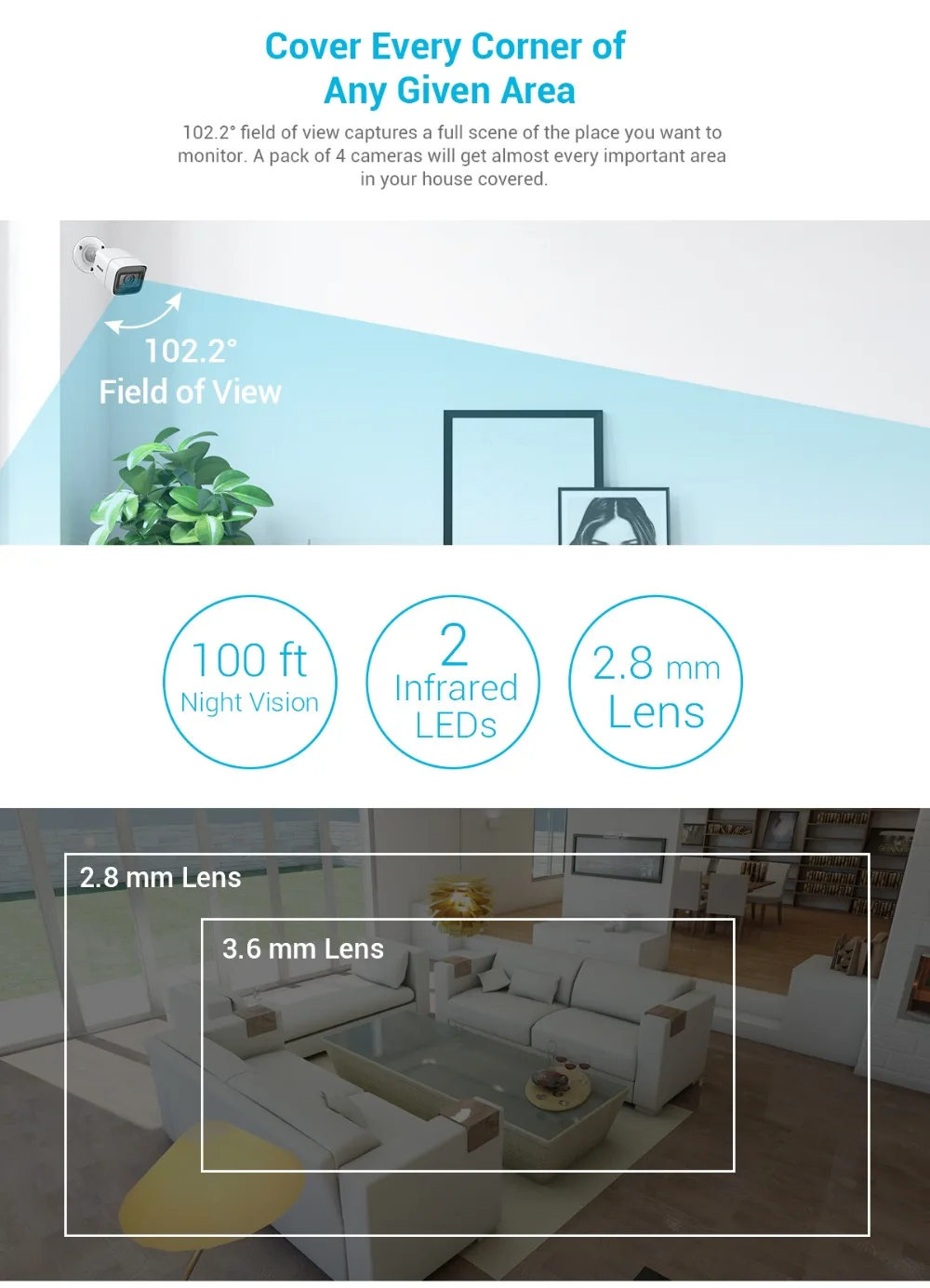 102,2 ° Поле обзора фиксирует полную сцену места, которое вы хотите контролировать. Пакет из 4 камер получит почти все важные области в вашем доме.