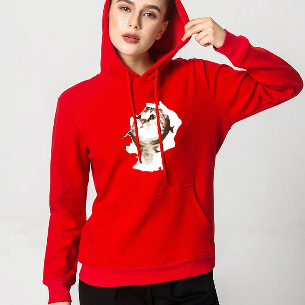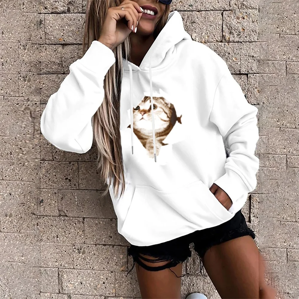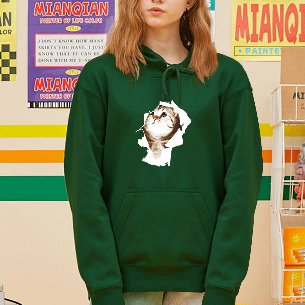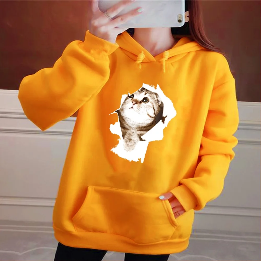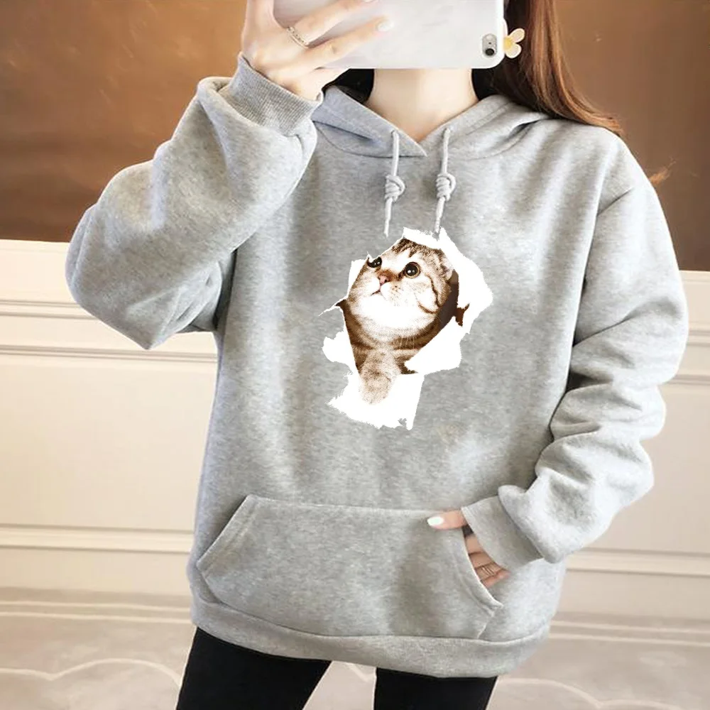 Толстовка Женская с длинным рукавом, Модный свитшот с принтом милого котенка, Свободный Топ с карманами, Повседневный пуловер для девушек