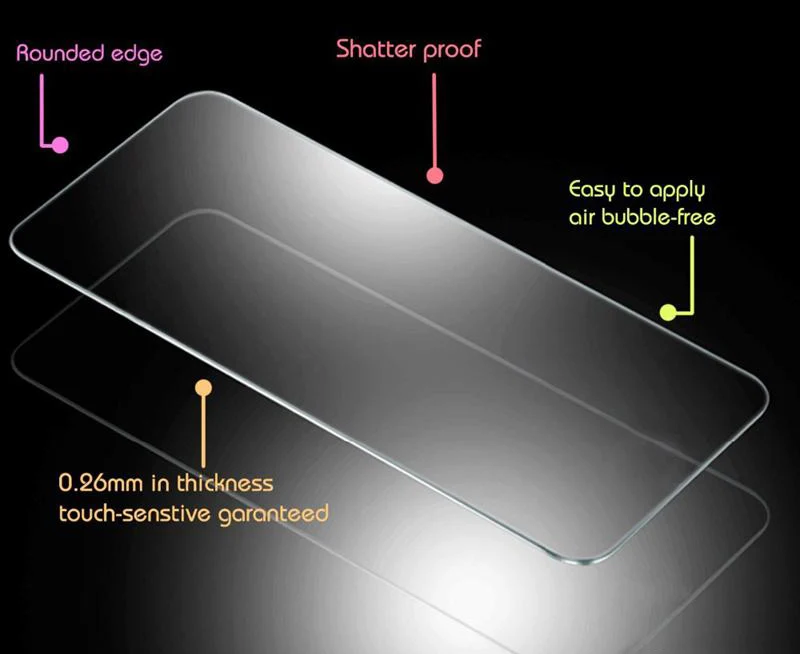 (3) Твердость поверхности-0,26 мм толщина и сделано с химически обработанным, прозрачным закаленным стеклом. 8-9H: даже острые предметы, такие как ножи и ключи, не царапают закаленное стекло.