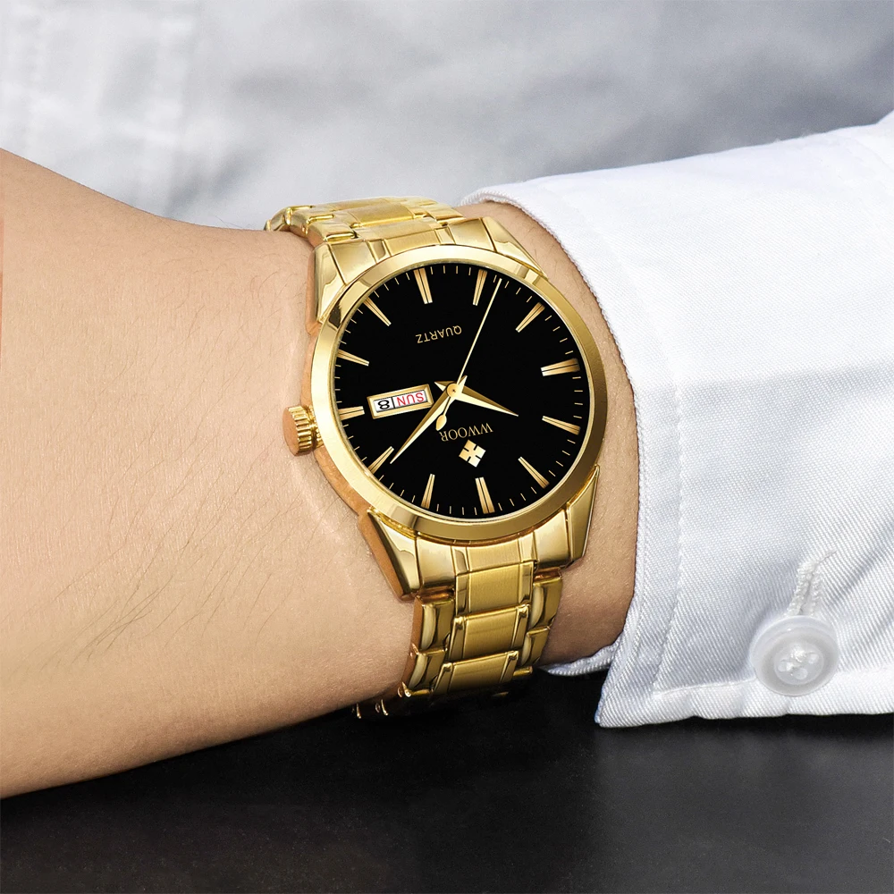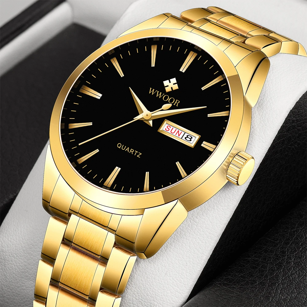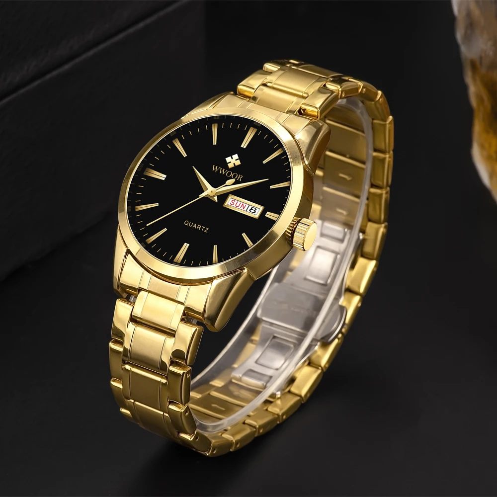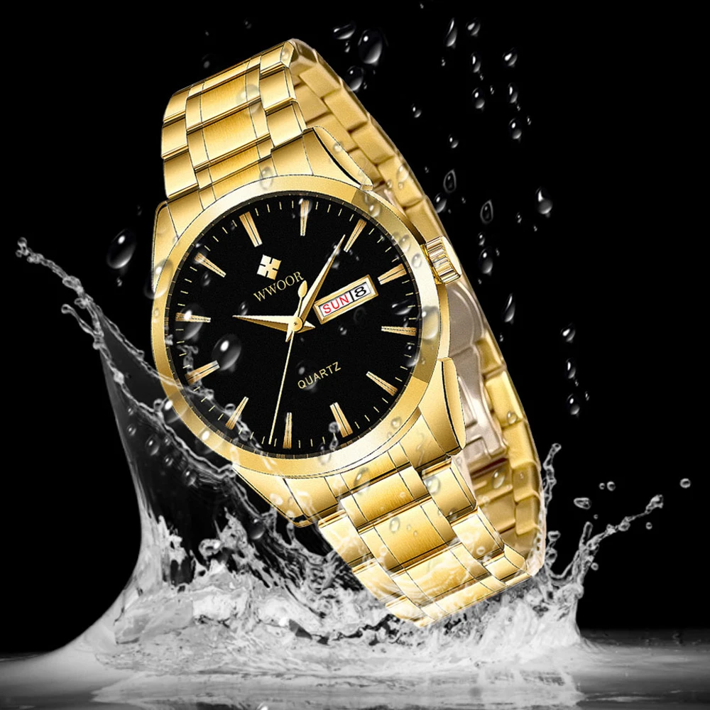 Часы WWOOR мужские наручные водонепроницаемые, модные брендовые роскошные золотистые, с недельным циферблатом, из нержавеющей стали