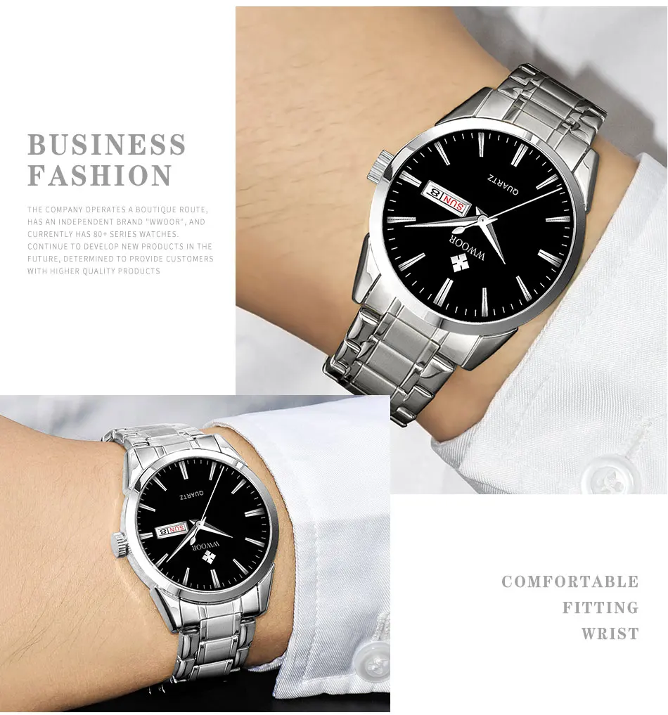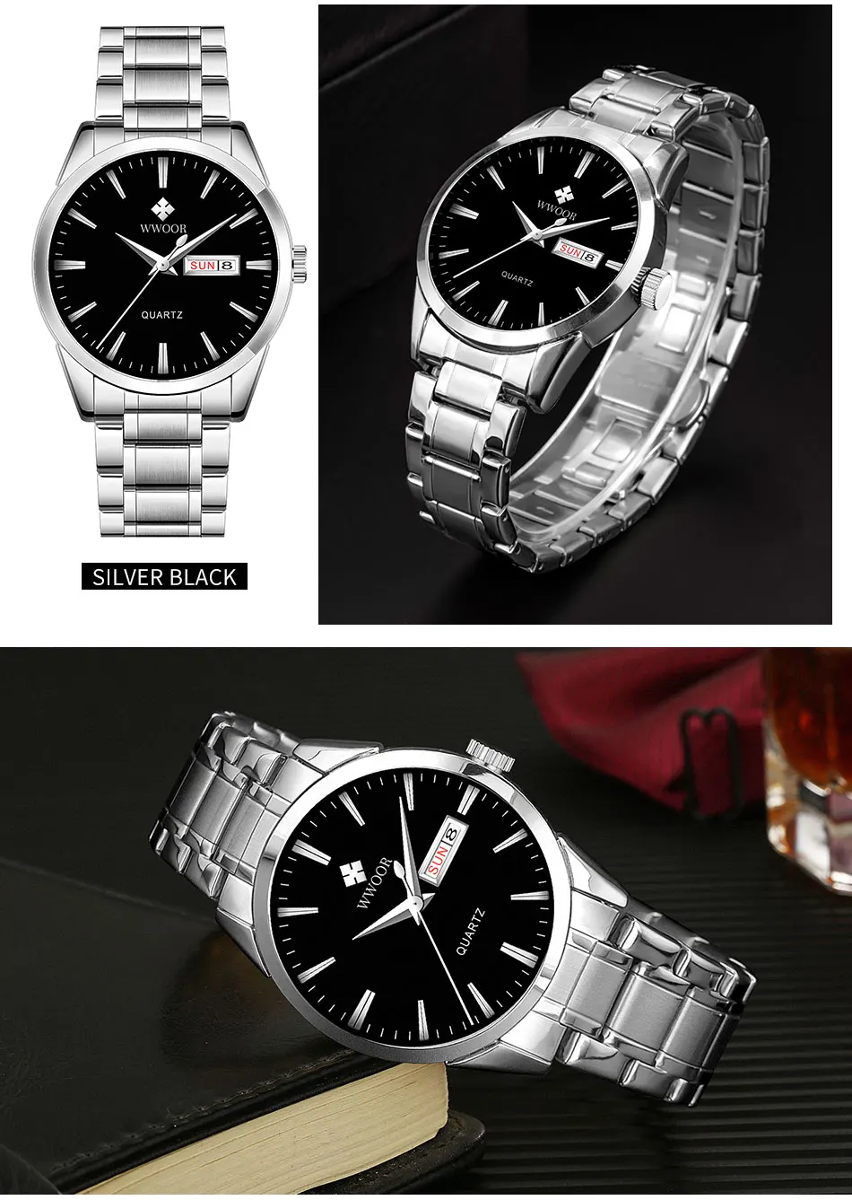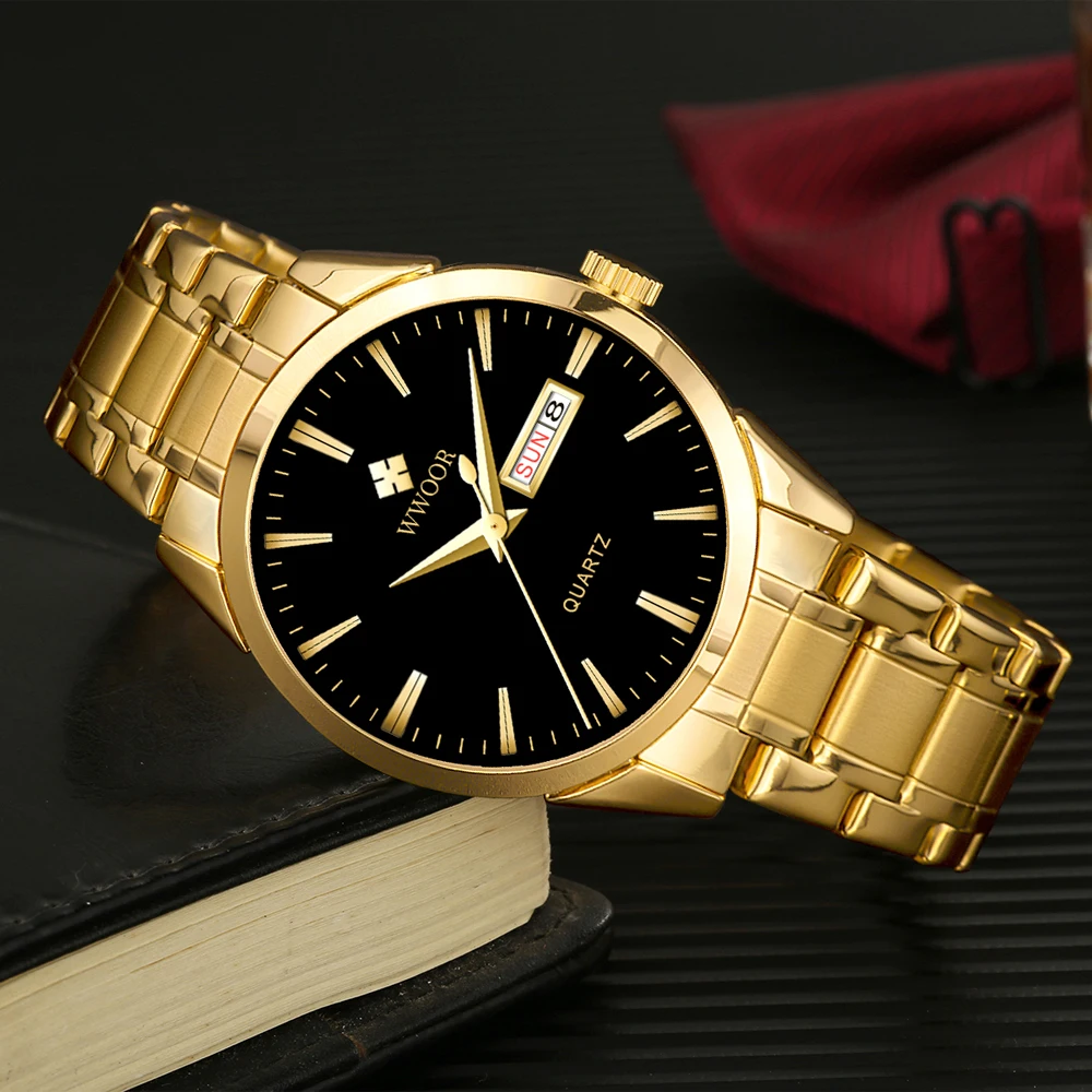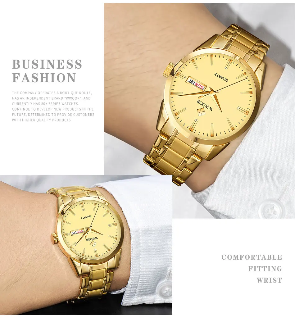 Часы WWOOR мужские наручные водонепроницаемые, модные брендовые роскошные золотистые, с недельным циферблатом, из нержавеющей стали
