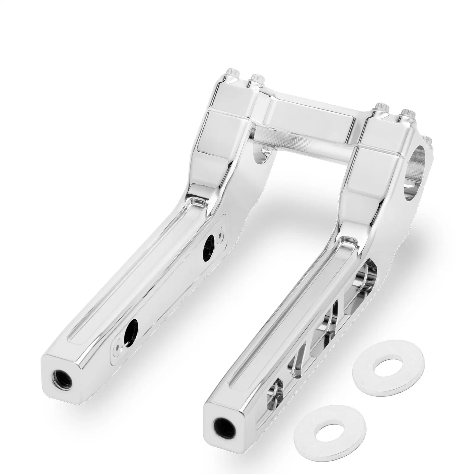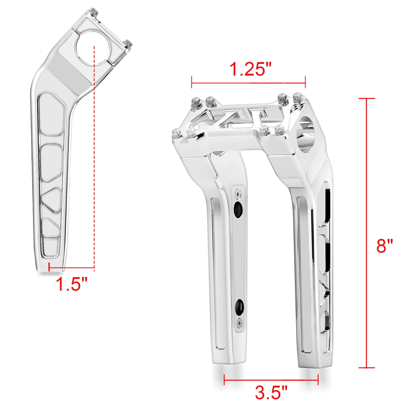 > Легко надевается на болт.> Высота зажима: 8 дюймов, может поднять руль около 8 дюймов> Диаметр зажима: 1,25 дюймов> Потяните: 1,5 дюймов> Сделано из CNC алюминиевой заготовки с тройной хромированной отделкой> Необходимо использовать OEM винт установки (болты не включены)