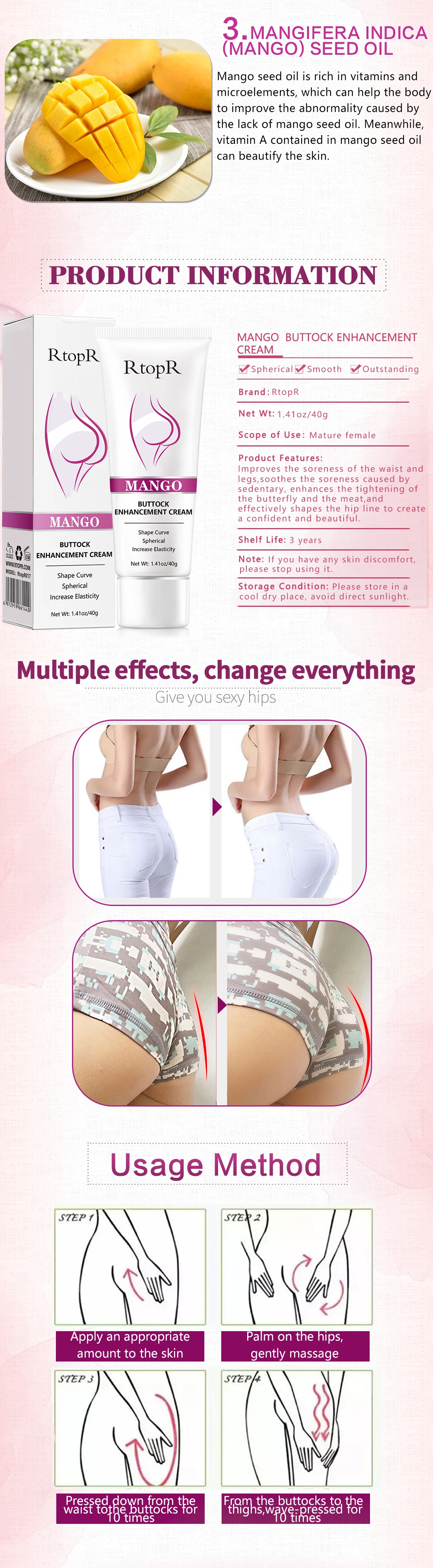 Богатые экстрактами манго и женьшеня, проникают в нижнюю часть кожи, чтобы обеспечить клеточное питание. Улучшите болезненность бедер, вызванную долгим сидением, упругой кожей, затяните жир бабочки и эффективно сформируйте линию бедер, дайте вам мягкую ягодицу, сделайте вас более уверенными и сексуальными.