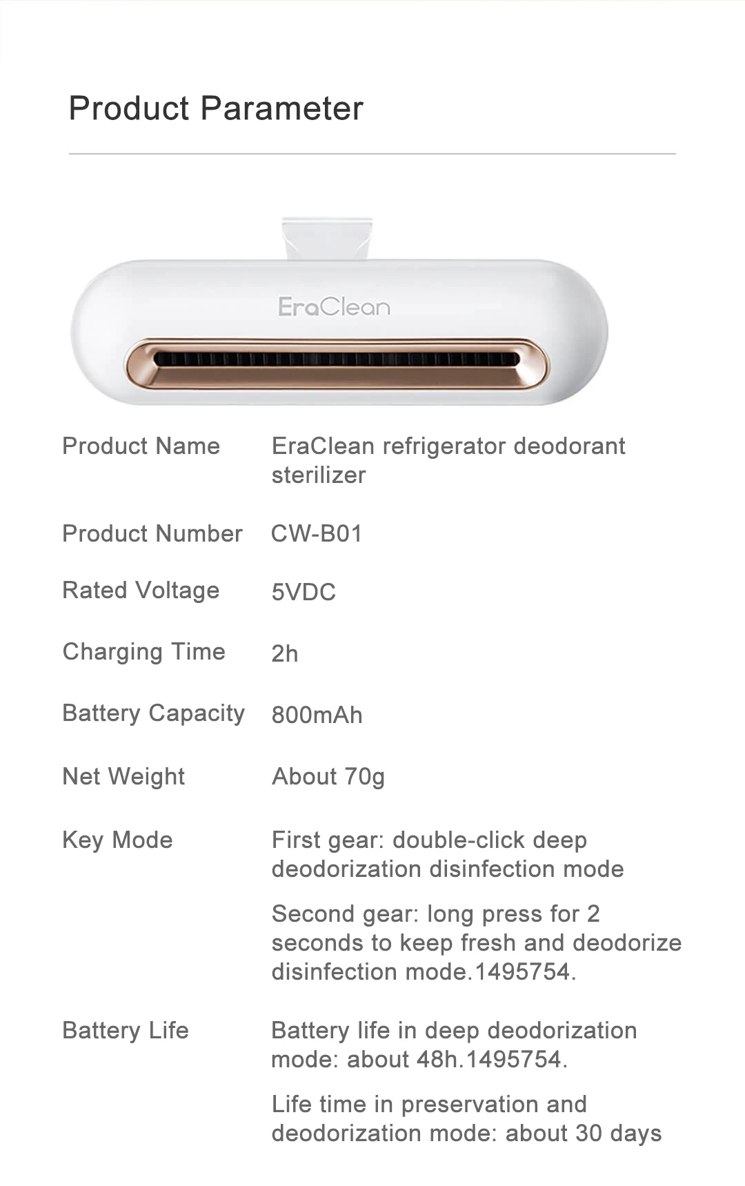 Емкость аккумулятора: 800 мА · ч Номинальное напряжение: 5 В постоянного тока Вес нетто: около 70 г Время, необходимое для полной зарядки: около 2 ч режим кнопки: Первая передача: двойной щелчок дезодоранта дезинфекция режим вторая передача: длительное нажатие в течение 2 секунд, чтобы сохранить свежесть и Дезодорировать режим дезинфекции Время жизни: время жизни в режиме дезодорирования: Около 72 ч срок службы в режиме свежести и дезодорирования: около 30 дней