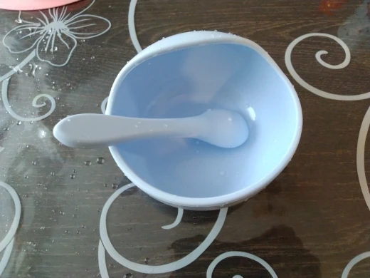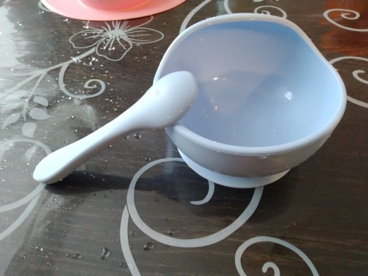 Шикарная миска! И миска и ложечка умеренно мягкие, тарелочка с липучкой, ребёнок не уронит! Без запаха. Очень довольна покупкой!