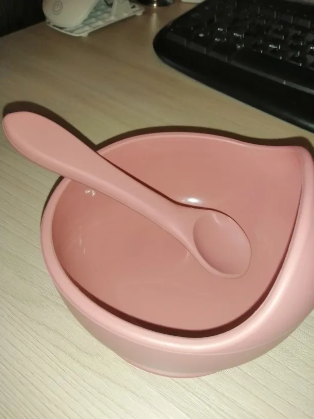 хорошая силиконовая посуда, только жаль к нашему детскому столу не липнет, а на обычный стол и кухонный гарнитур хорошо прилипает, так что дело в поверхности нашего стола, продавца рекомендую быстро отправил