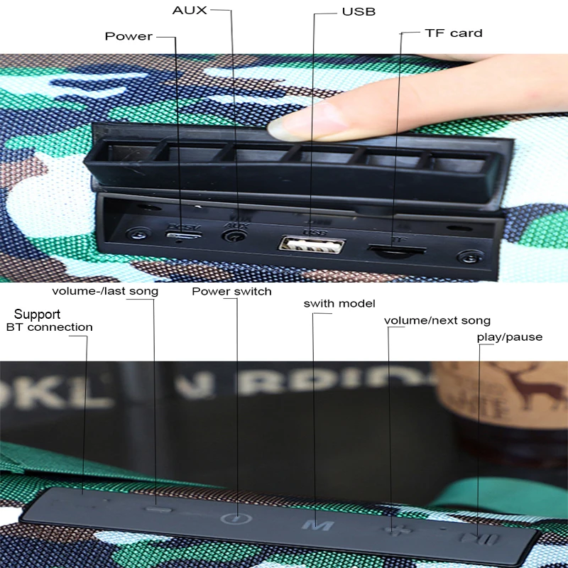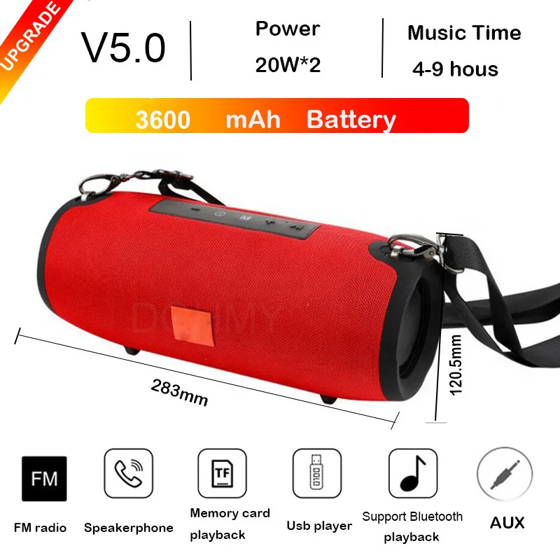 Характеристика1. Портативный съемный плечевой ремень длиной до 120 см.2. Сетчатая крышка для защиты динамика от воды, пыли, ударов.3. IPX5 водонепроницаемый, пыленепроницаемый, ударопрочный.4. Большая мощность с двумя басовыми диафрагмами с каждой стороны, вибрирует при воспроизведении музыки.5. Цилиндрическая форма и встроенный левый и правый канал обеспечивают 360 ° стерео.6. Функция вызова, микрофон с шумоподавлением позволяет вам отвечать на звонки, не достигая телефона.7. Fm-приемник позволяет свободно слушать радио.8. Поддержка tf-карты или misro sd-карты до 32 г, поддержка AUX, поддержка USB 2,0 диска.9. Функция TWS, вы можете подключить два динамика с помощью одной синхронизации телефона. (включите два динамика, нажмите «M» одного динамика для подключения двух динамиков вместе.)10. Простое кнопочное управление, вы можете нажимать кнопки для включения/выключения, воспроизведения/паузы, переключения режима, пропуска песен, регулировки громкости и т. Д.11.Bluetooth4.2-Совместимость, Со всеми устройствами, совместимыми с Bluetooth.12. Аккумулятор емкостью 1200 мА · ч обеспечивает до 8-10 часов воспроизведения при 2/3 громкости при полной зарядке.13. Это не только беспроводной динамик, но и радио, проводной динамик, басовая бум-бокс.СпецификацияВерсия: 5,0Расстояние по уровню поверхности: <33FtПоддержка: FM, вход для карт TF, вход для u-диска, аудиовход 3,5 ммРасширенная Память: 32G (не входит в комплект)Емкость аккумулятора: 1200 мА · чВремя зарядки: 2-3 часаВремя прослушивания/разговора: 6-10 часовСтепень водонепроницаемости: IPX5Параметры зарядки: 5 ВПоддержка формата музыки: MP3, wav, wma, FLAC, APEАмплитудно-Частотная характеристика: 100 Гц-20 кГцСоотношение сигнал/шум: ≧ 95 дБСтепень искажений: <1%Материал: АБС-пластикЦвет: черный, синий, красный, камуфляжРазмер продукта: 94.8x98.7x220mmВес нетто продукта: 900 г