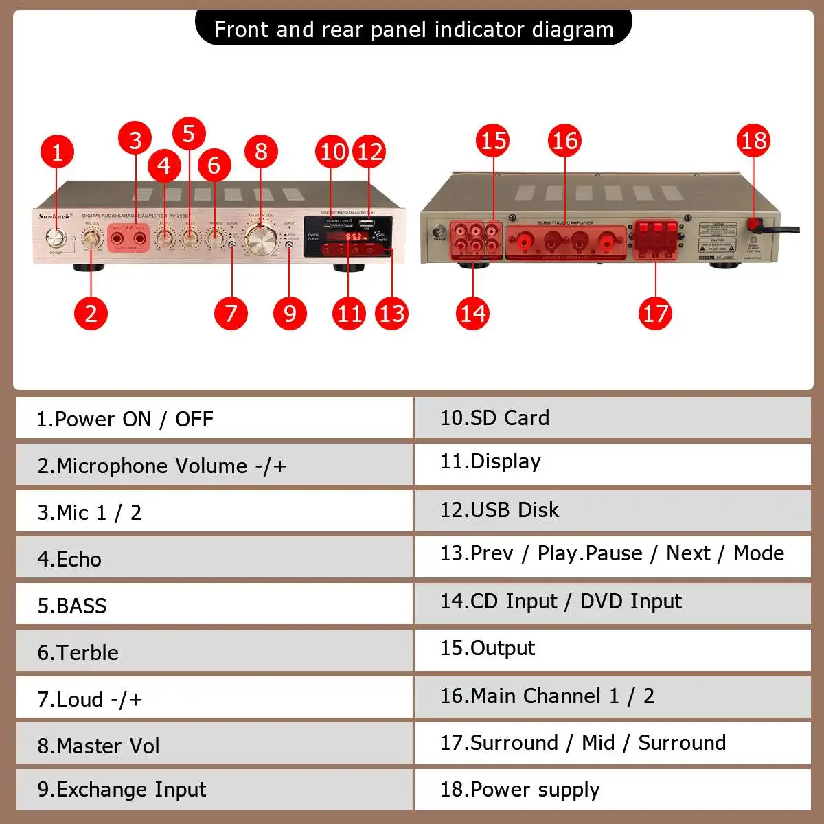 5-канальный усилитель мощности SUNBUCK, bluetooth, Hi-Fi стерео динамик, усилитель, поддержка FM-радио, 2 микрофона, вход USB SD-карты, 2200 Вт