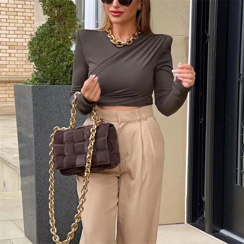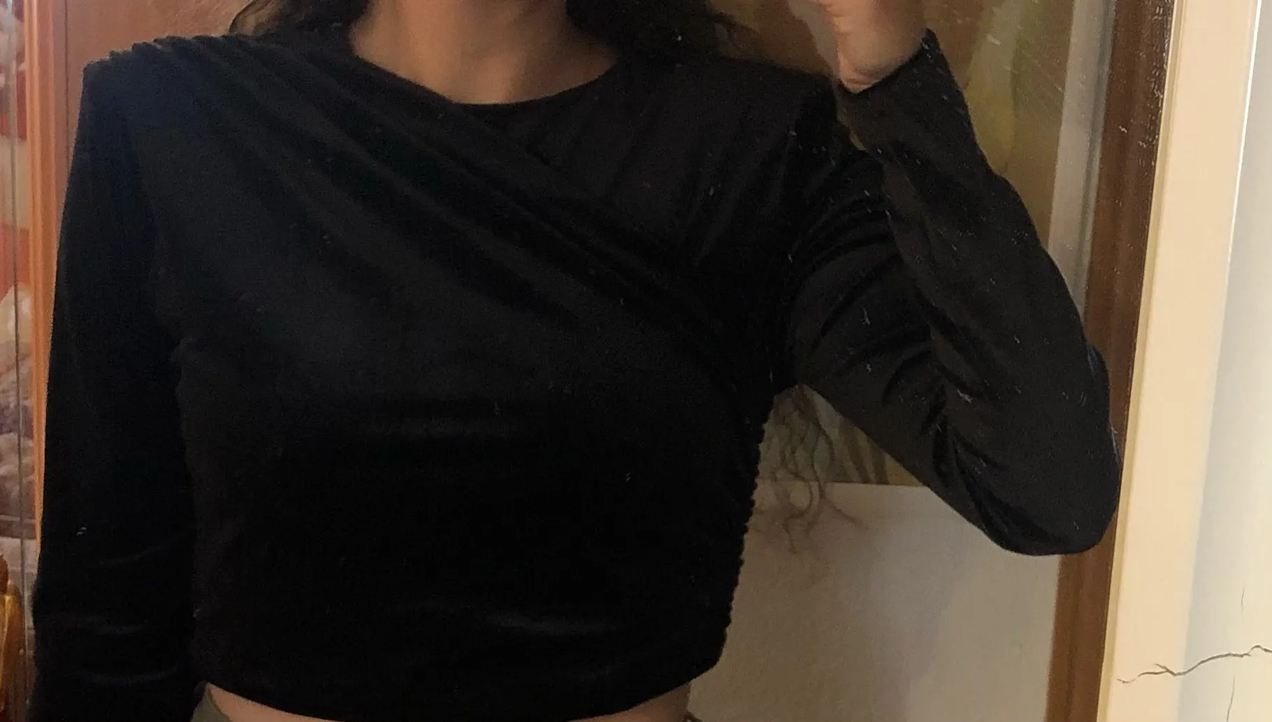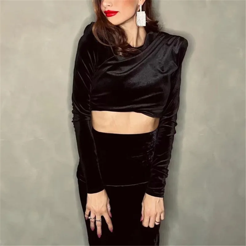 Топ женский плиссированный бархатный с наплечниками и длинным рукавом