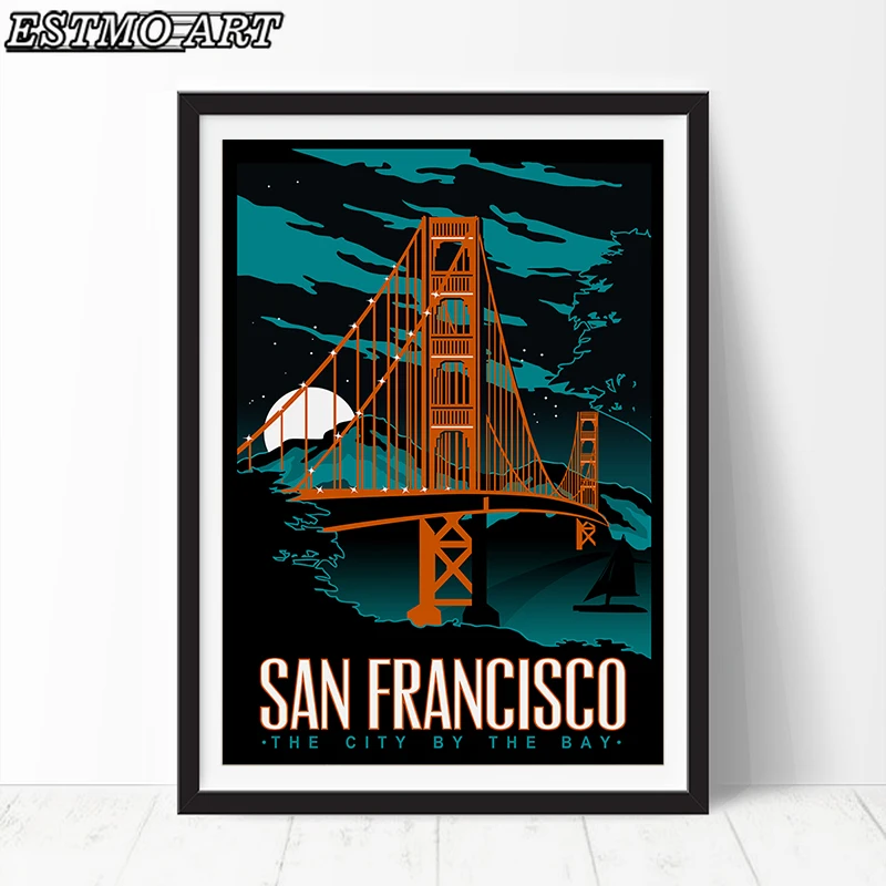 Плакаты с изображением пейзажа моста Сан-Франциско, настенные постеры синего и черного цветов для туристической достопримечательности в скандинавском стиле, домашний декор для гостиной, спальни