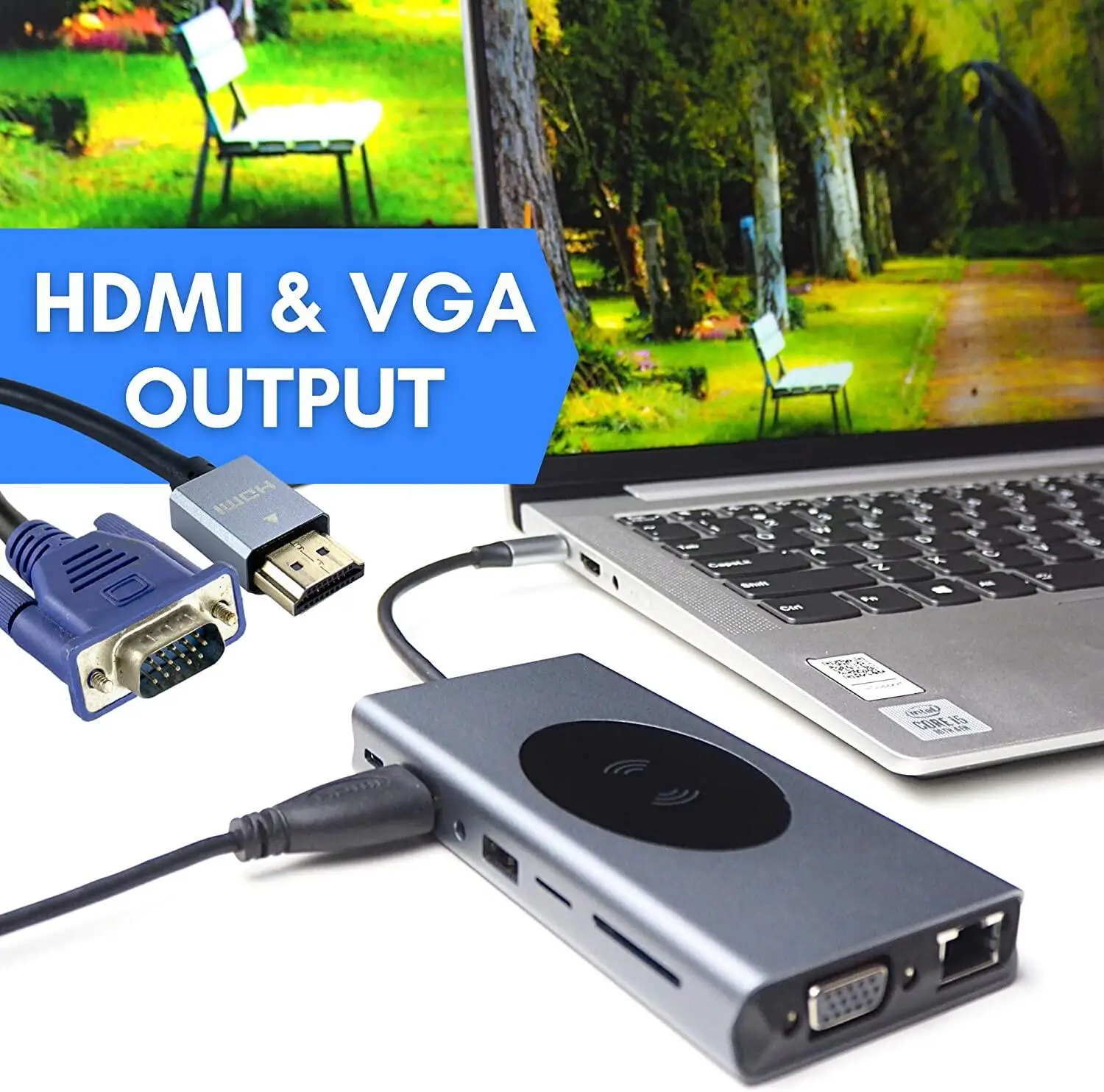 【 15 в 1 POWEREXPAND + 】: подключи и работай, этот usb-хаб Type-C совмещает функцию USB c Hub и док-станции, он оснащен 15 портами с 4K @ 30Hz HDMI портом/VGA портом/беспроводным зарядным устройством/SD/TF кардридером/3 * USB 3.0 Порты/4 * USB 2,0,/Тип C PD зарядки (зарядка только)/3,5 мм аудиоразъем/Gigabit Ethernet, которые могут использоваться одновременно.