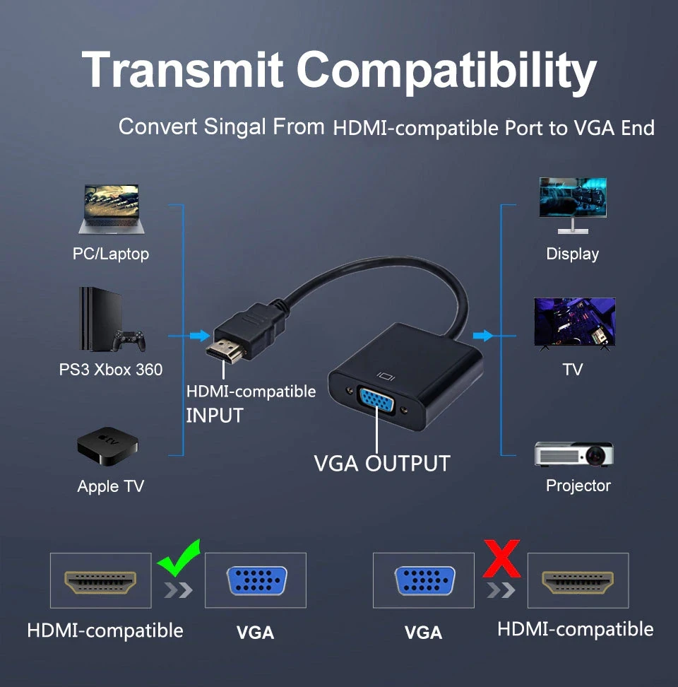Подходит для всех устройств, совместимых с HDMI входом и VGA выходным интерфейсом