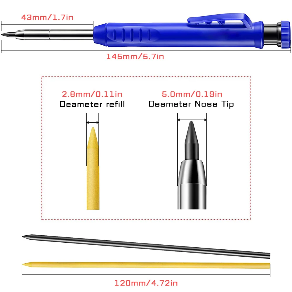 1.【Производитель глубоких отверстий 】: Время проектирования карандаша плотника с глубоким отверстием составляет 45 мм и наконечник носа, достигая труднодоступных мест, в то время как другие знаки плотника не могут. Подходит для сквозных отверстий или других узких зон.