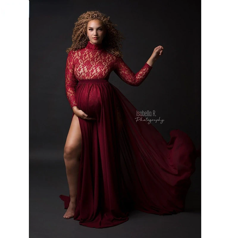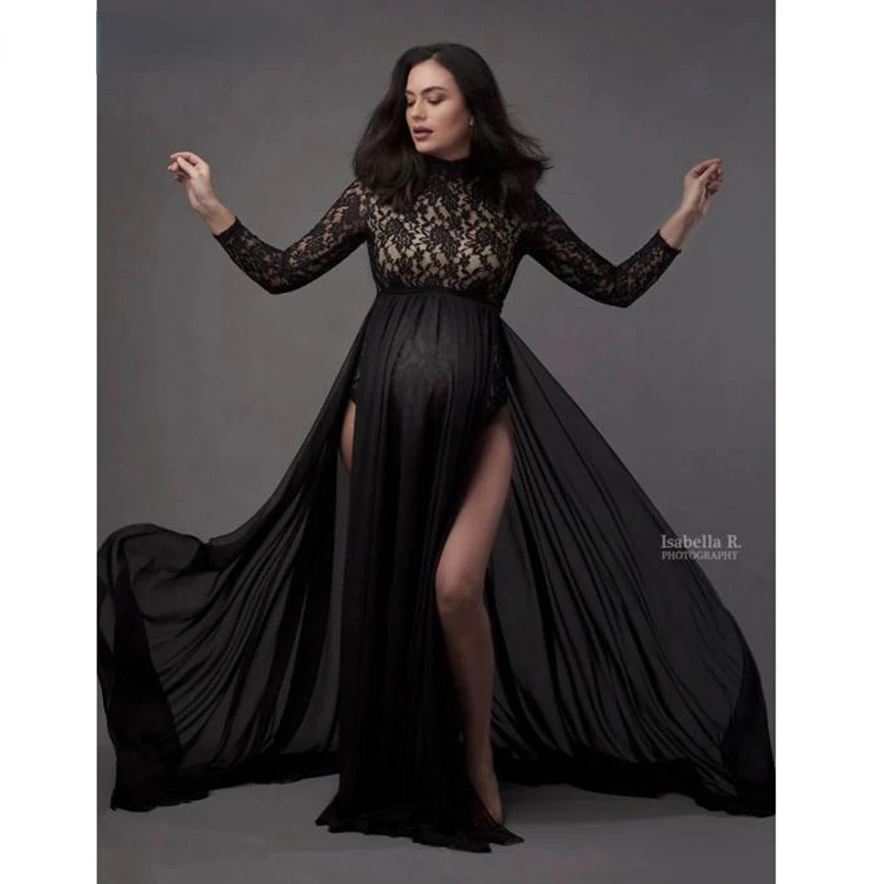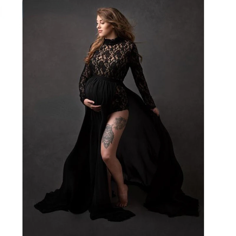 Элегантные кружевные платья для беременных для фотосессии боди с длинным рукавом + платье-макси для беременных с высоким разрезом