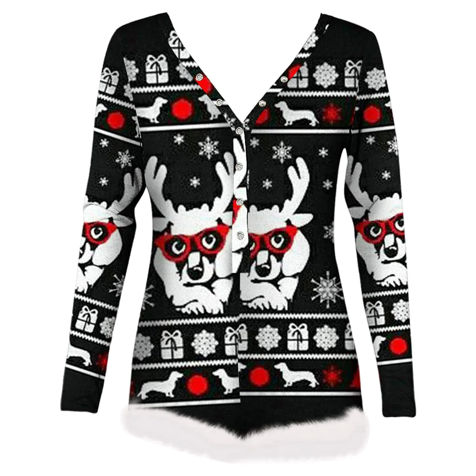 Женское боди с рождественским принтом, плюшевый боди с длинным рукавом и V-образным вырезом, облегающее эластичное трико, короткий комбинезон на пуговицах, Пижамный комбинезон, Комбинезоны