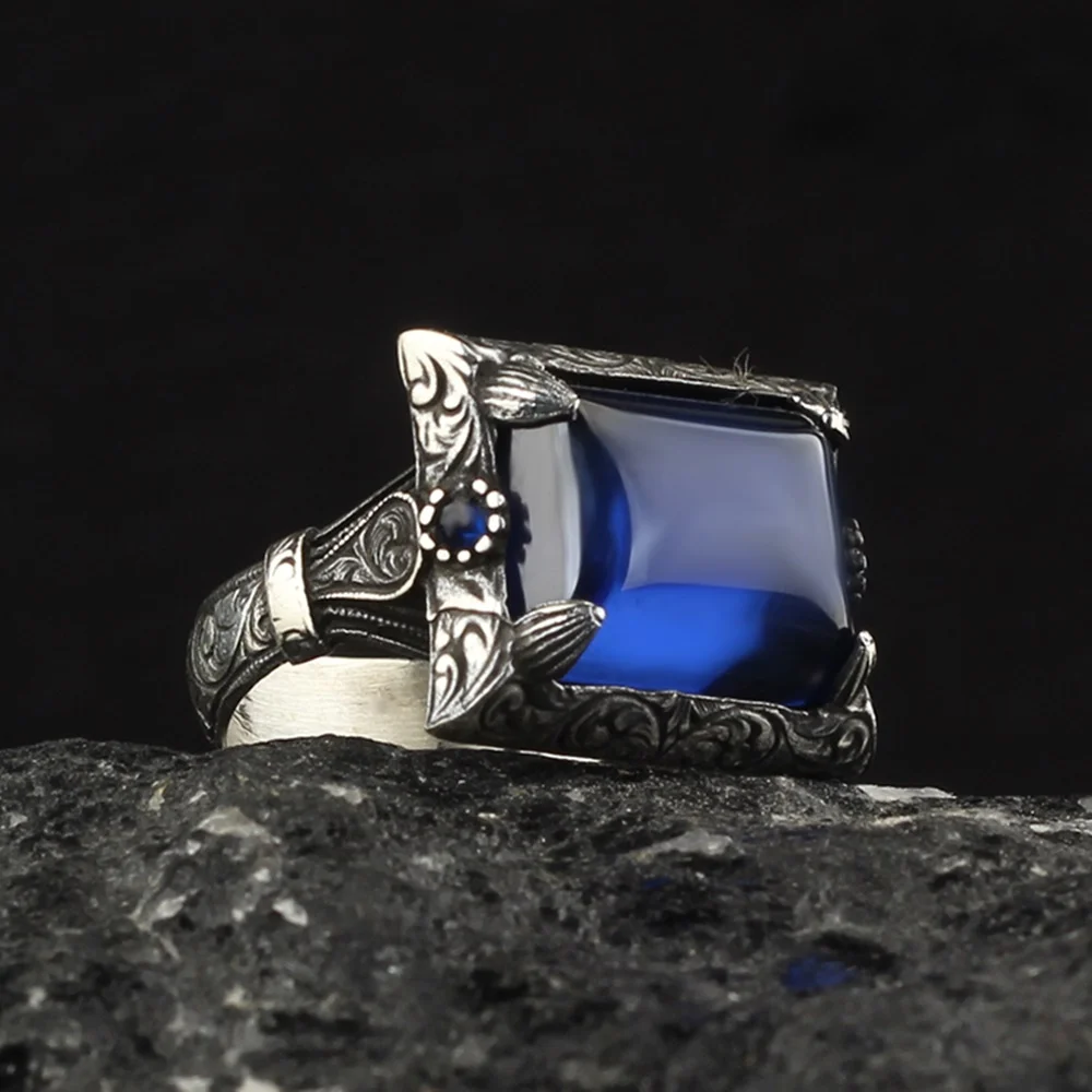 Мужское кольцо ручной работы из серебра 925 пробы с синим сапфиром