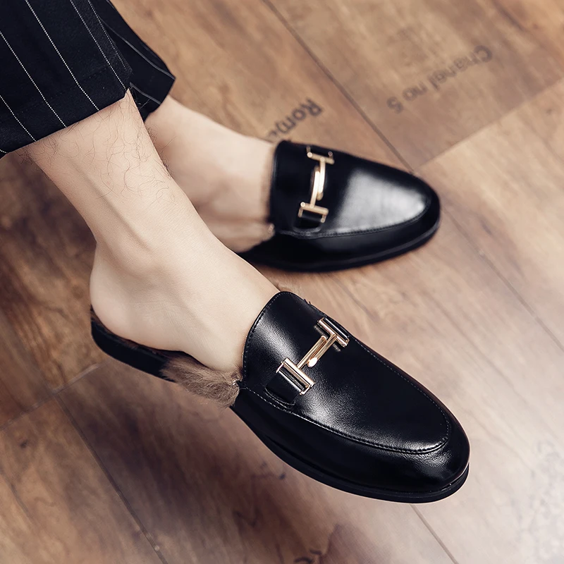 Мюли мужские зимние из натуральной кожи, дизайнерские лоферы, роскошные меховые туфли, тапки для парикмахера, полуботинки для дома, на лето