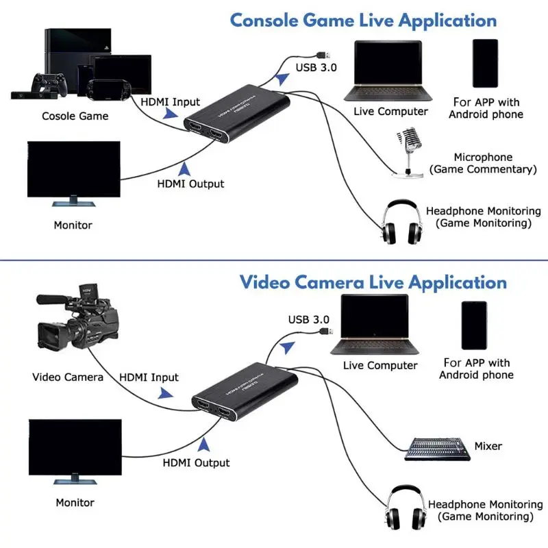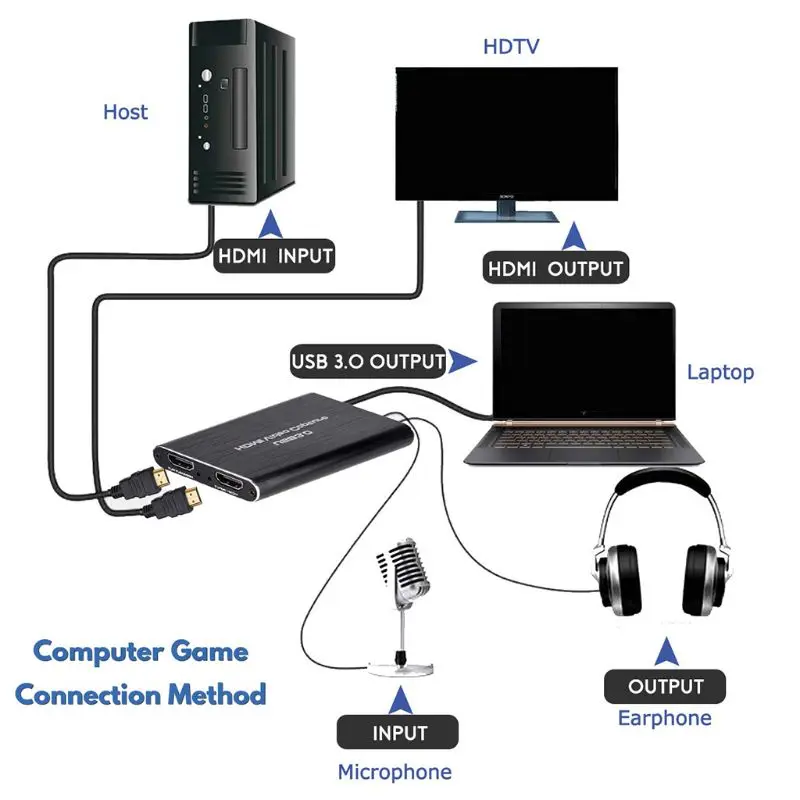 Подключается к ПК или мобильный телефон с помощью USB3.0 интерфейс через много бесплатных третьей вечерние в режиме воспроизведения музыки и программное обеспечение для сбора для того чтобы достигнуть предварительного просмотра в режиме реального времени, запись, приобретение, прямую трансляцию и другие функции, получение видео HDMI соответствует стандартам UVC и UAC, прост в использовании.