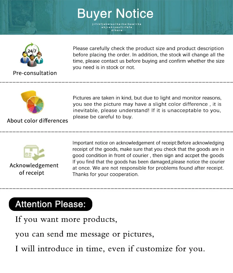 1. Ваше удовлетворение и положительные отзывы очень важны для нас. Пожалуйста, оставьте положительные отзывы и 5 звезд, если вы удовлетворены нашими товарами и услугами.2. Если у вас есть какие-либо проблемы с нашими товарами или услугами, пожалуйста, не стесняйтесь связаться с нами, прежде чем оставить отрицательный отзывы. Мы сделаем все возможное, чтобы решить любые проблемы и предоставить Вам лучшее обслуживание клиентов