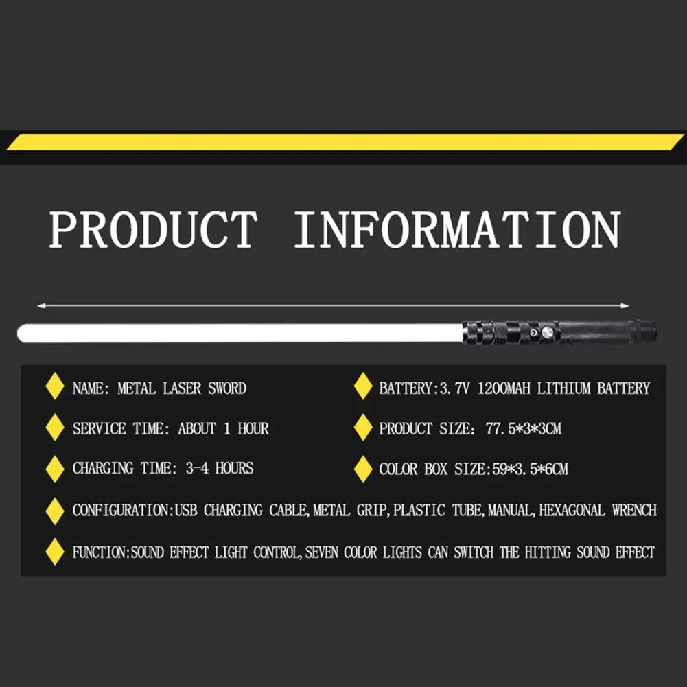 Точки пули:1. 【Высокое Качество: 】 рукоятка Lightsaber изготовлена из металлического алюминия с улучшенным процессом полировки, более гладкой и удобной; И часть трубы изготовлена из ударопрочного поликарбоната с толщиной 2 мм, более прочная и прочная.2. 【 встроенный имитационный звук: 】 световой меч разработан со встроенными имитационными звуками, такими как плавные качели, бластер, столкновение, нарезка по воздуху и многое другое, позволяет пересечь реальный мир фильмов.3. 【Светодиодный реалистичный светильник Saber:】 светильник части трубы достаточно яркий с 7 цветами, чтобы изменить, идеально подходит для косплея, тренировок, спорта, для развлечения, мастерства и многого другого. И он прост в использовании.4 、 【Fast зарядки: 】 более стабильной и безопасности 3,7 V 1200 мА/ч, литий-ионный аккумулятор, 2-3 часа быстрой зарядки. Это идеальный подарок для детей на Рождество, день рождения и другие праздники.5. 【Пожалуйста, обратите внимание: 】 если у вас есть какие-либо вопросы в будущем, пожалуйста, не стесняйтесь обращаться к нам по электронной почте. Мы сделаем все возможное, чтобы решить ваши проблемы.Описание:Световой меч прочный и прочный, гладкий и более удобный, так как рукоять изготовлена из металлического алюминия с улучшенным процессом полировки и часть трубы изготовлена из ударопрочного ПК с толщиной стенки трубки 2 мм. Он имеет 7 изменяемых цветов и реалистичные встроенные звуки.Характеристики:Название: световой мечВес: 355 гРазмеры: 77,5x3x3 см/30,51x1,18 x 1.18inУпаковочный лист:Usb-кабель для зарядки * 1Металлический захват * 1Пластиковая трубка * 1Инструкция * 1Шестигранный ключ * 1Примечание: