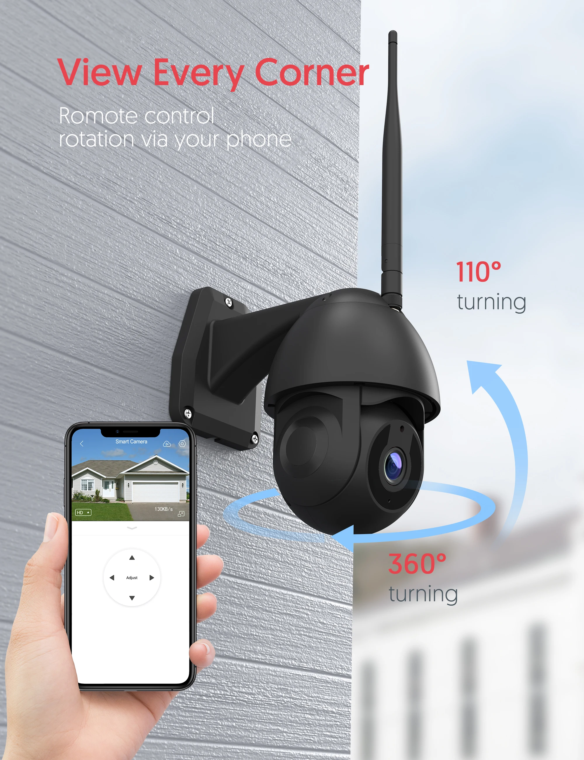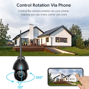 Мобильный телефон вращение управления: Эта наружная камера безопасности обеспечивает вращение на 360 ° по горизонтали и на 110 ° по вертикали. Покрывает больше пространства и уменьшает слепоту.