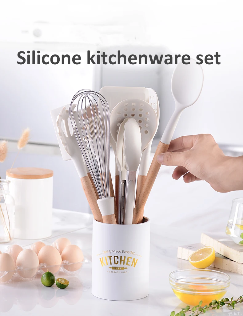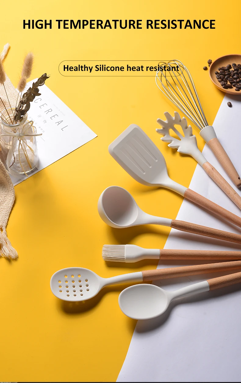 Белый Силиконовый Набор принадлежностей для готовки, многофункциональная кухонная посуда с деревянной ручкой, шпатель, кухонный гаджет, аксессуары для приготовления пищи