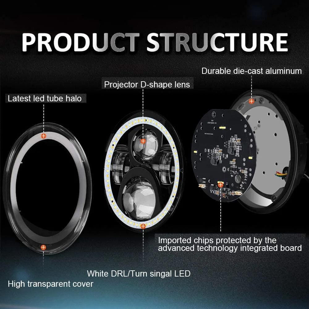 1. Изготовлен из высокая интенсивность Cree светодиодный чипы, гораздо ярче, чем оригинальные или других подобных 7 дюймов светодиодный фары для автомобиля2.DOT EMARK- E9-R10/RoHS / CE утвержден, IP67 Водонепроницаемый гарантирует, что ваши огни являются легальными на дороге, удовлетворяя требованиям, установленным в соответствии с международными стандартами безопасности двигателя.3. Идеальный светильник, вырез острый и прямой, не слепить встречного движения.4. Высококачественный корпус из литого алюминия, усовершенствованная система отвода тепла.5. Новейший уникальный и красивый дизайн внешнего вида, встроенный EMC для защиты от электромагнитных помех.