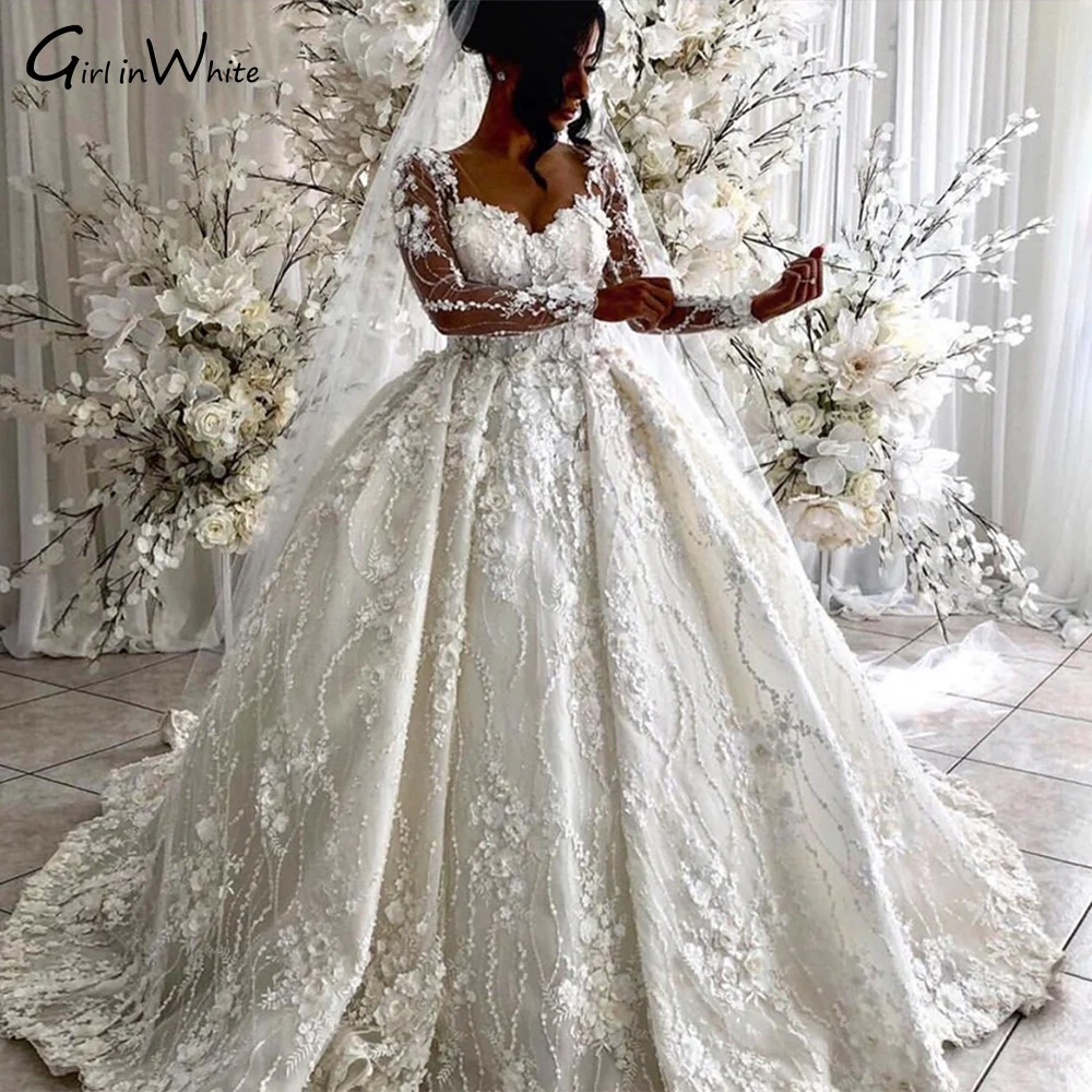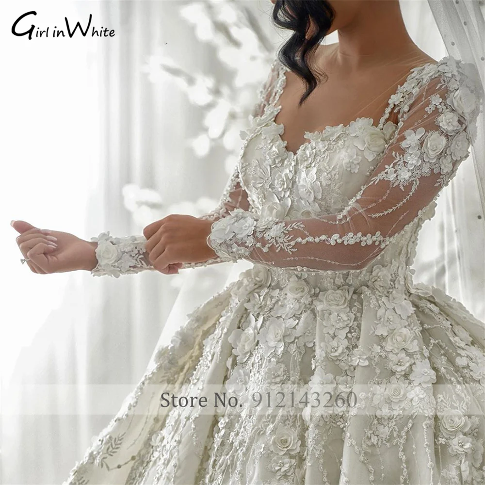 Роскошное кружевное бальное платье с аппликацией, свадебное платье 2022, романтичное свадебное платье с 3D цветами и длинным рукавом