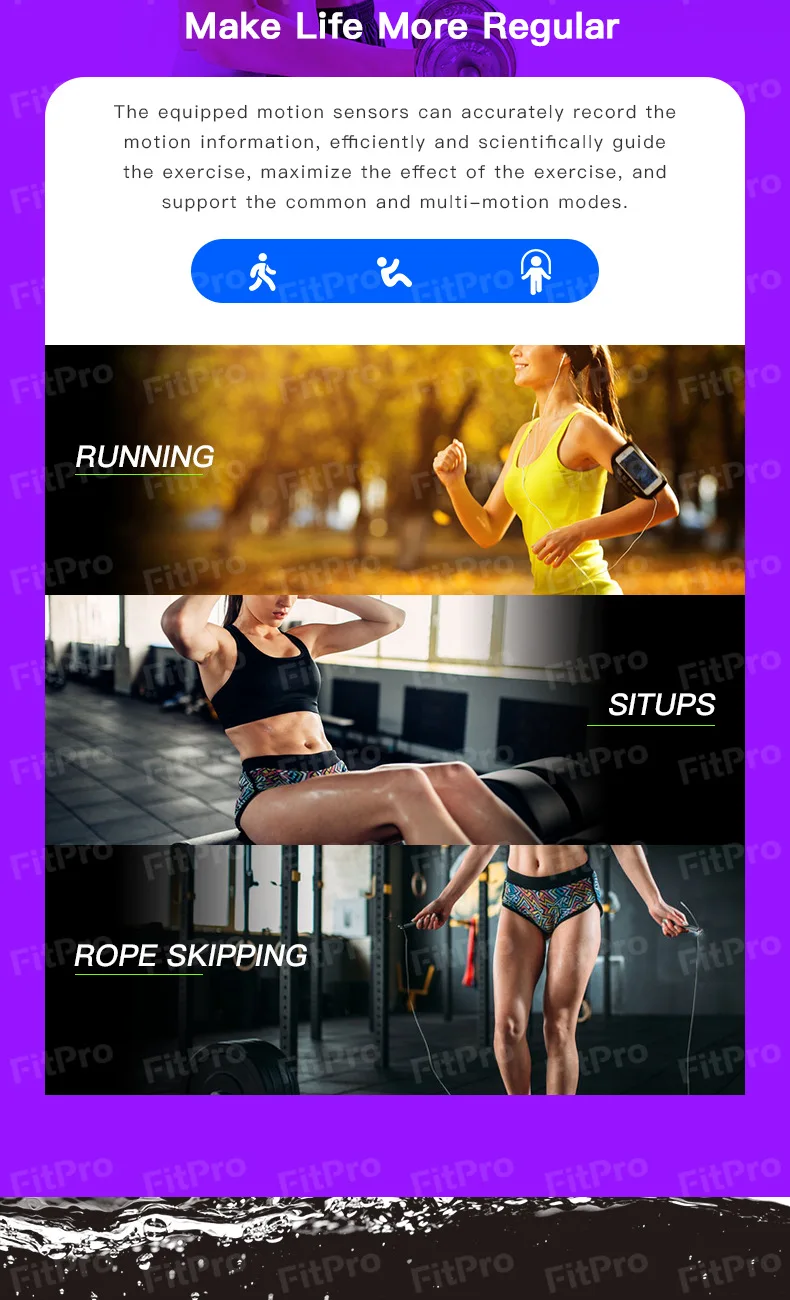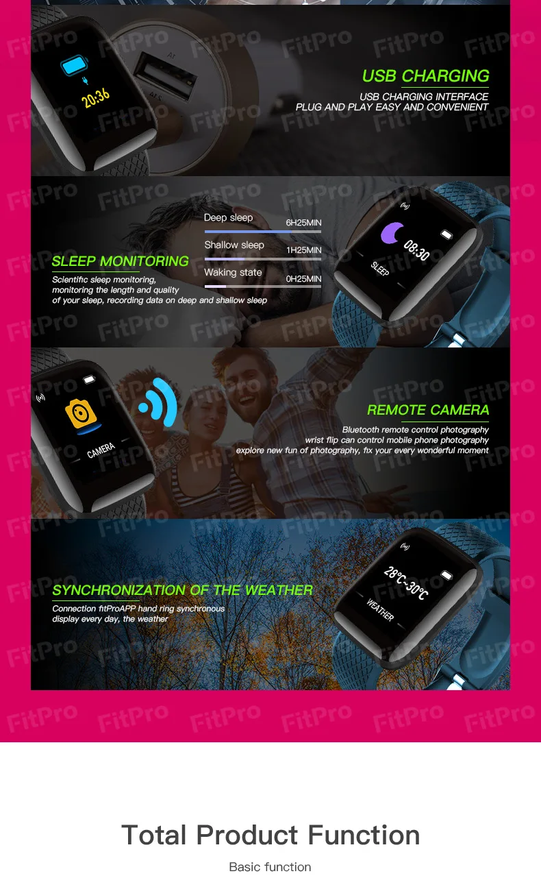 Уровень водонепроницаемости: IP67Режим работы: сенсорная кнопкаСовместимость ОС: для Android, для IOSОсновные функции: шагомер, пульс, кислород в крови, кровяное давление, напоминание о сообщениях, монитор сна, удаленная камера, поиск моего телефона, будильник, дата, напоминание о сидячем положении, погода...Приложение: Fitpro