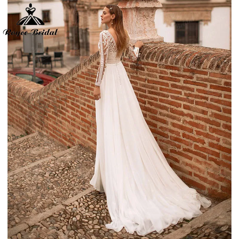 Женское свадебное платье с V-образным вырезом, длинным рукавом и кружевным лифом