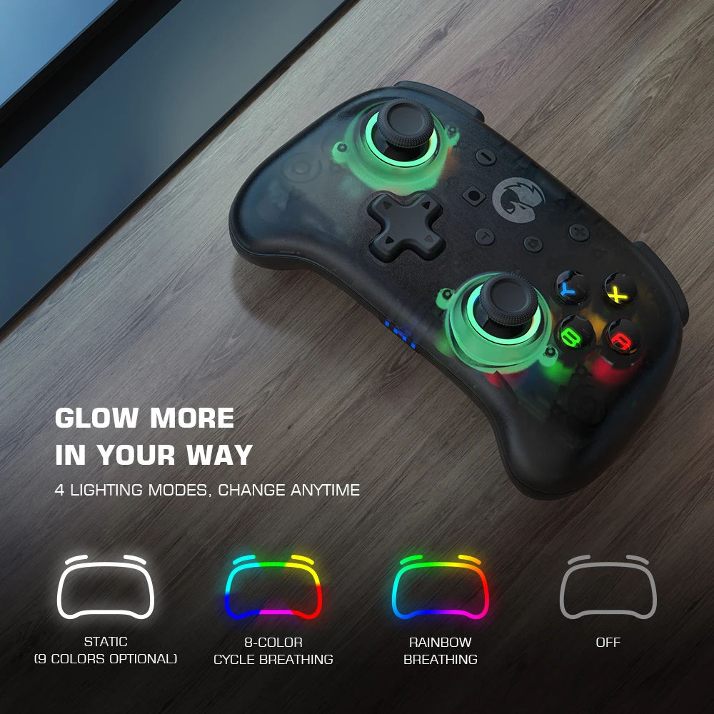 4 типа подсветки на джойстиках позволяют вашему геймпаду светиться по желанию или не светиться. Настройка цвета и режима подсветки также может создавать различную игровую атмосферу в различных сценариях, будь то напряженный или расслабляющий, что делает вас более погруженными в игровой мир. Есть одна поговорка в перевернутом виде: «Но каждый раз за некоторое время вы находите кого-то, кто радует, и когда вы это сделаете, ничего не будет сравнивать». Здесь, на T4 Mini, вы также можете найти радугу 3 способами (статический/цикл/дыхание). Пусть это принесет удачу вашим играм. А. Статический (9 цветов на выбор, синий, красный, зеленый, желтый, голубой, оранжевый, фиолетовый, розовый и Радужный цвет) B. 8-цвет цикла дыхания C. Радужное дыхание D. Скидка