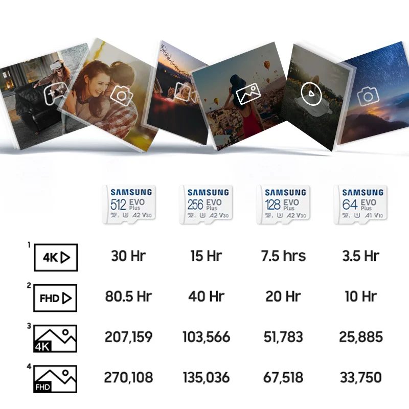 ⊃ 2; Заявленная производительность достигается за счет использования карт памяти microSD EVO Plus с адаптерами Samsung.
