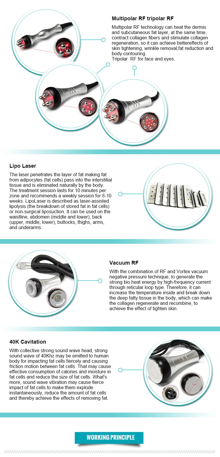 Посылка включает:Многополярная RF головка для корпуса x 1Кавитационная головка 40 кГц x 1Вакуумная двухслойная RF головка x1Три полярных RF головки для лицевых поверхностей вокруг x 1Четырехполюсная RF головка для лица и Bodx1Шнур питания x 1Позиционная пластина: x8Вес продукта: 9,2 кгРазмер изделия: 23х21х33смРазмер упаковки: 40х32х35смНапряжение: 110 В 220 В 50-60 Гц1. Системная или местная гибель;2. Повышает скорость метаболизма организма, усиливает избавление организма от отходов и влаги;3. Ремонт растяжек;4. Расслабляет мышцы, снимает мышечные спазмы, снимает мышечные боли;5. Рука затягивает стенку, ноги, бедра, бедра, поясницу, мышцы живота, реформирующий тип;F. Эффективно улучшает ягодицы и кожу, похожую на апельсиновую кожуру, решая проблему после родов.Предостережения1. Сначала очистите кожу, затем используйте специальный гель или эфирные масла для похудения;2. Снимайте все металлические украшения при использовании машины;3. Избегайте слишком долгого нахождения в одном месте. Избегайте использования на костях;4. После использования машины непрерывно в течение 1 часа, пожалуйста, позвольте машинеОтдых около 10-15 минут;5. При использовании щупа с разрывом жира у некоторых гостей появляется шум в ушах, это явление является нормальным.6. Не используйте дезинфекционные средства для очистки зондов, рекомендуется использовать влажное полотенце или хлопок;Примечание: Этот продукт не предназначен для диагностики, смягчения, лечения, лечения или предотвращения любых заболеваний