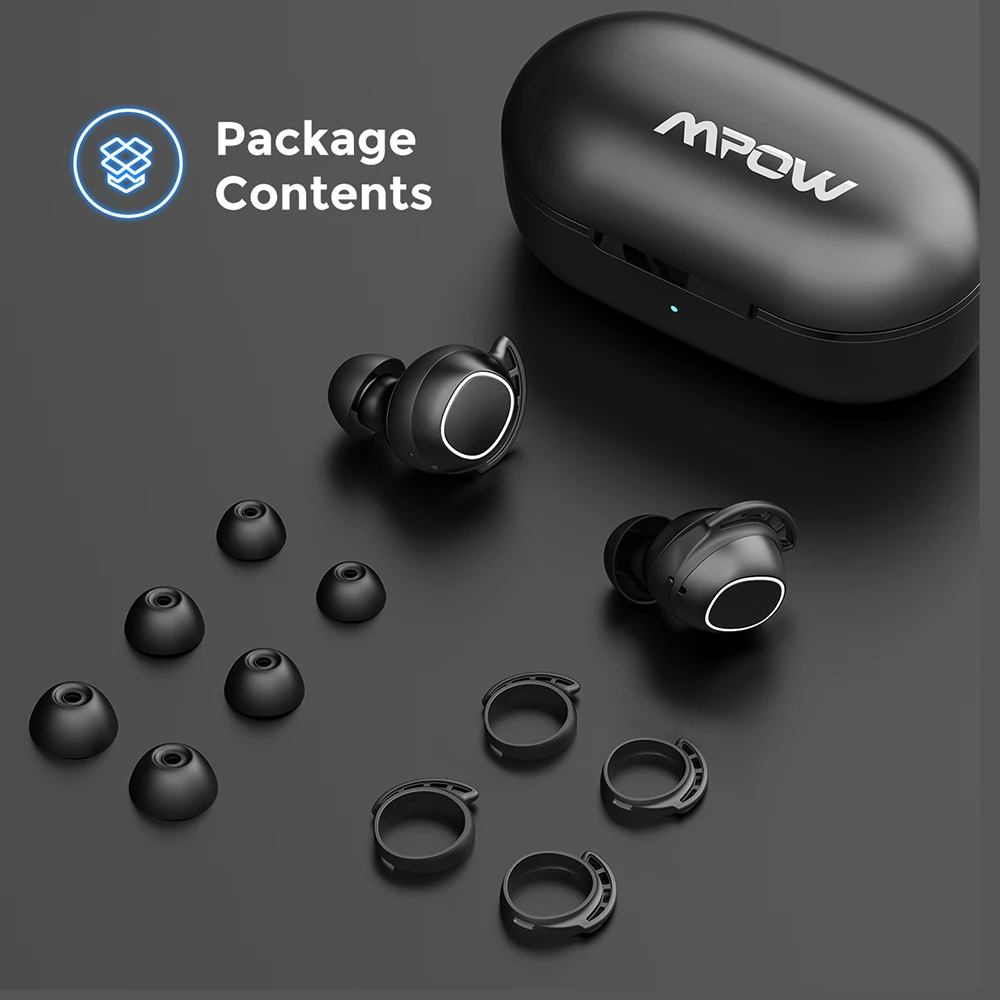 MPOW M30 настоящие беспроводные наушники x 1 параЧехол для зарядки-1 шт.Силиконовые Наушники x 3 пары (S, M,L. Размер M предустановлен на наушниках.)Силиконовые ласты x 2 пары (S,M. Размер M предустановлен на наушниках.)Зарядный кабель типа C x 1Руководство пользователя-1 шт.