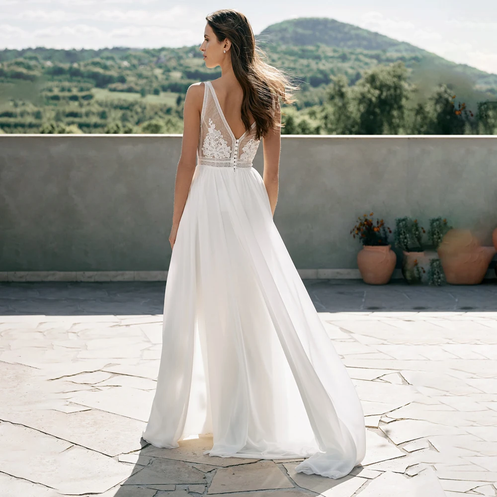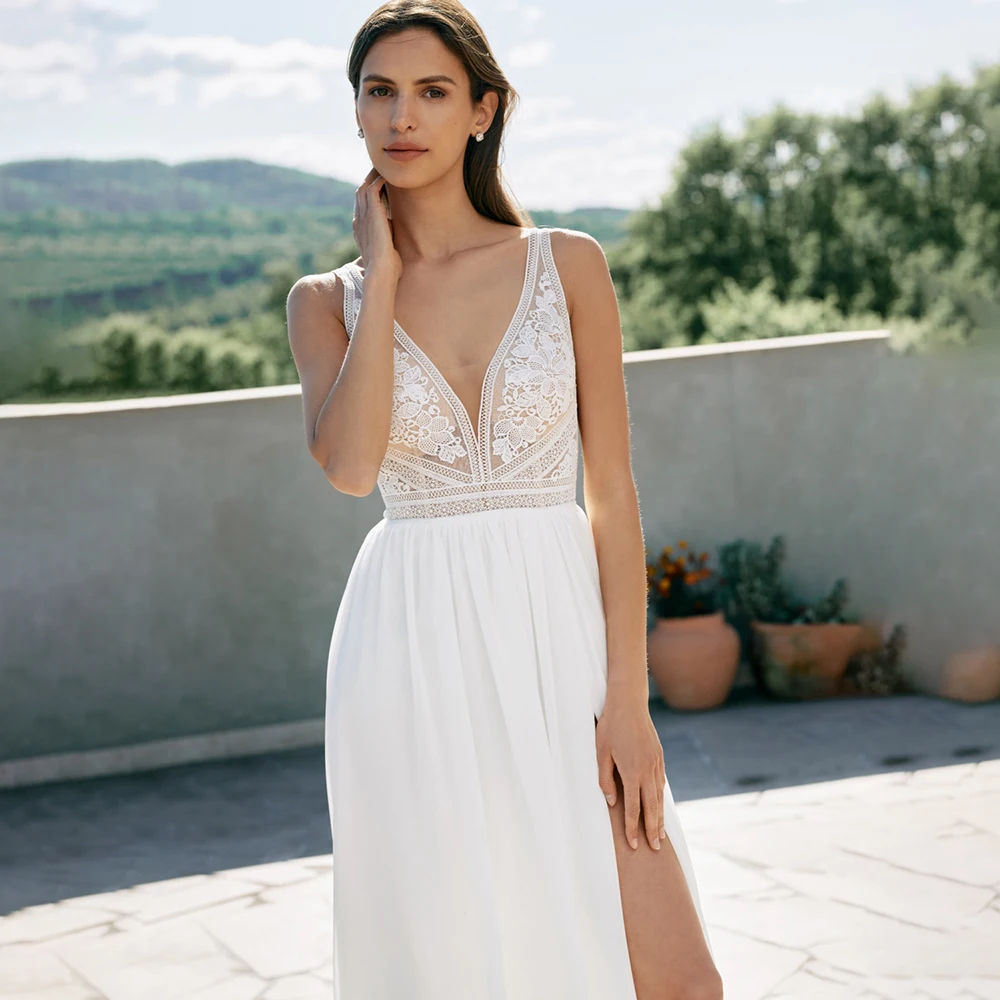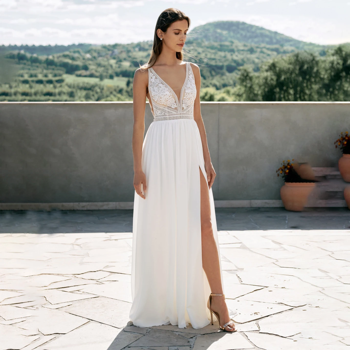 Шифоновые Свадебные платья-трапеции Roycebridal, с V-образным вырезом, без рукавов, с открытой спиной и высоким разрезом, кружевные пляжные свадебные платья в стиле бохо, 2022