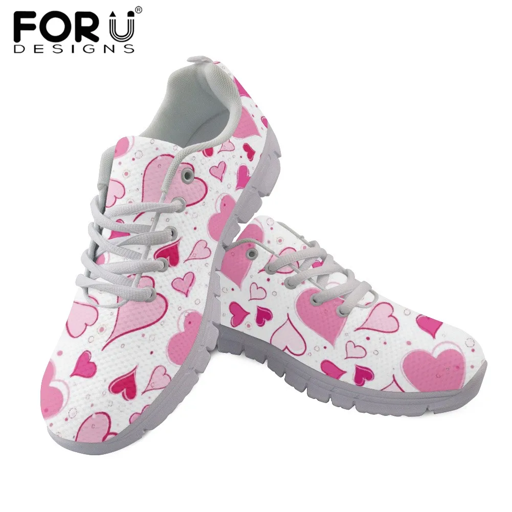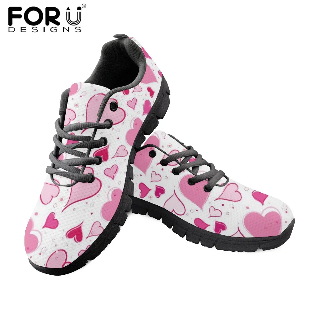 Женские сетчатые туфли на плоской подошве FORUDESIGNS, износостойкие кроссовки розового цвета с рисунком сердечек, дышащая обувь на плоской подошве для дам