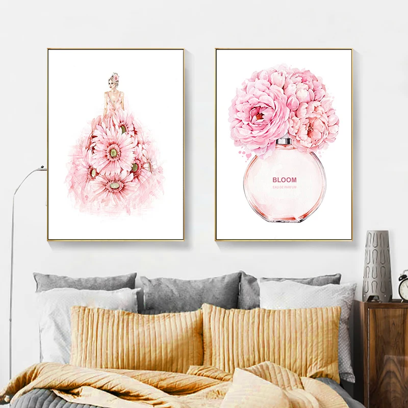 Современная розовая модная настенная Картина на холсте Цветочная девушка парфюм книга макияж печать плакат для салона красоты спальня декор картины
