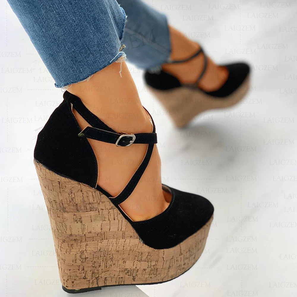 Женские туфли-лодочки SEIIHEM на танкетке с перекрестными ремешками, сандалии на высоком каблуке, женская обувь из искусственной замши, женская обувь для увеличения роста, большой размер 43 52