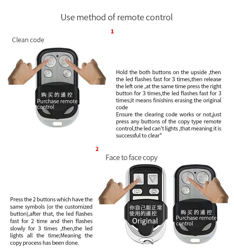 Одна рука держит оригинальный пульт дистанционного управления, в то время как другая держит копию дистанционного управления, два пульта дистанционного управления должны быть расположены как можно ближе (идеальная ситуация заключается в том, чтобы поставить два пульта дистанционного управления на рабочем столе бок о бок с нулевым расстоянием), соответственно, нажмите кнопку копирования, В тех случаях, когда светодиодный индикатор светильник быстро мигает через три вспышки, данный экземпляр успешным, другие ключевые методы работы одни и те же. Некоторые пульты дистанционного управления имеют меньшую мощность передачи, поэтому оригинальный пульт дистанционного управления должен быть помещен обратно на копировальный пульт дистанционного управления, чтобы работать. Для наличия шума, он должен избегать помех, чтобы работать, если копия не успешна, он должен быть восстановлен после очистки кода. (Внимание: ваш оригинальный пульт дистанционного управления должен быть в состоянии работать и таким же, как наш пульт дистанционного управления частотой)
