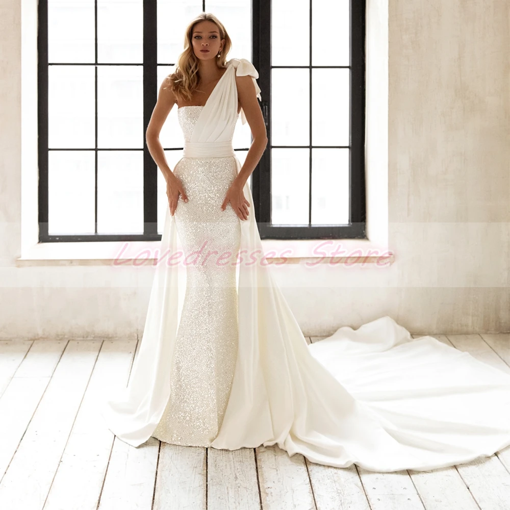Белое свадебное платье-футляр на одно плечо, без рукавов, без бретелек, в пол, с блестками, плиссированное, со съемным шлейфом, на молнии сзади, лето