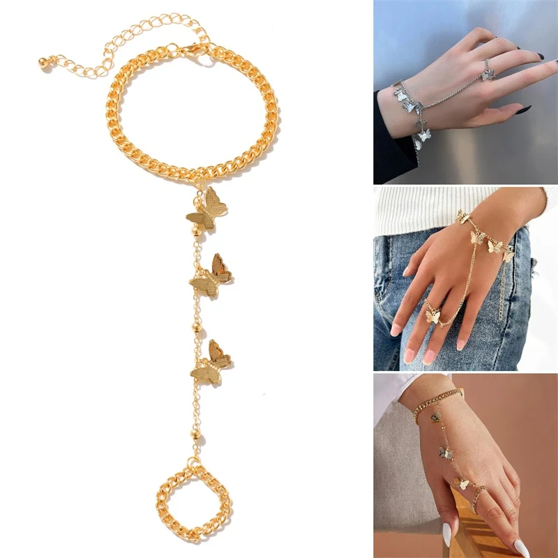 Браслет-бабочка 2 в 1 с кольцом на палец, цепочка на запястье с звеньями золотого и серебряного цвета для женщин, эстетическое Ювелирное Украшение 2022, рождественские подарки
