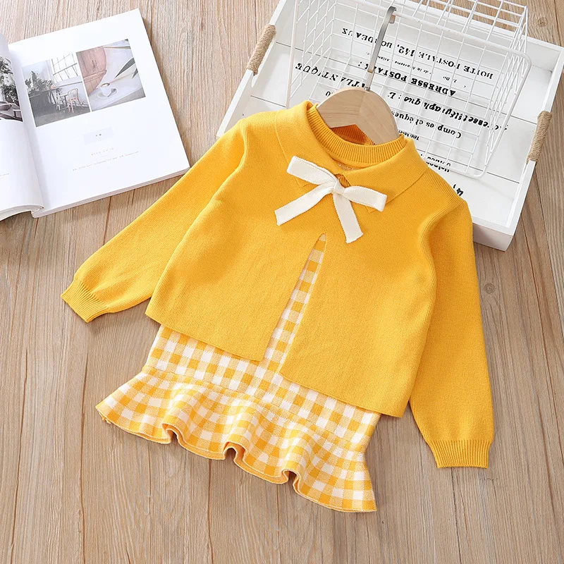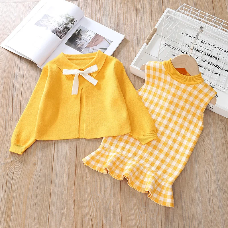 Вязаный свитер для девочек, комплект Свитера без рукавов, Милая зимняя праздвечерние чная клетчатая Одежда для девочек, детские весенние комплекты из двух предметов в Корейском стиле
